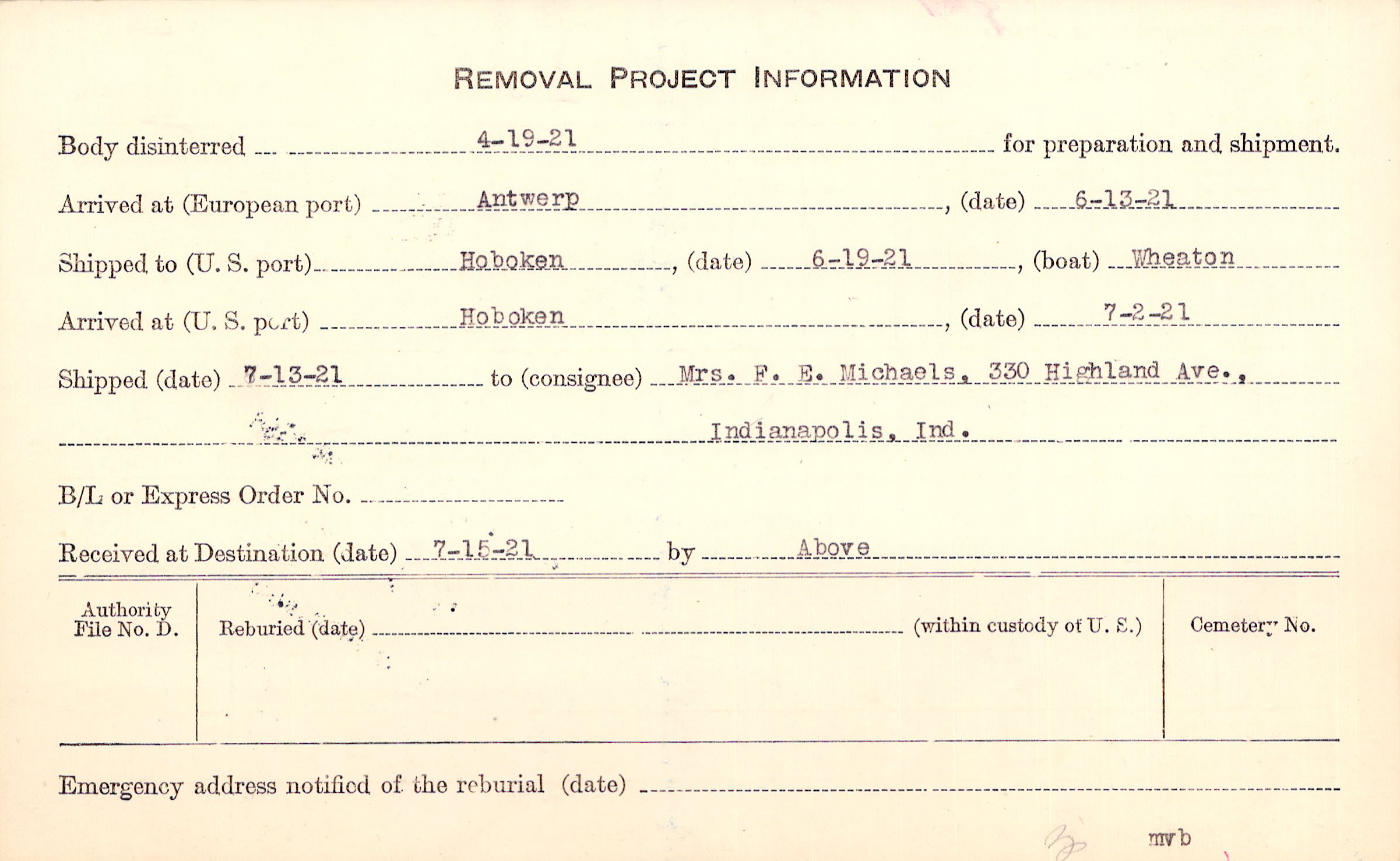 Body disinterred 4/19/1921 for preparation and shipment.