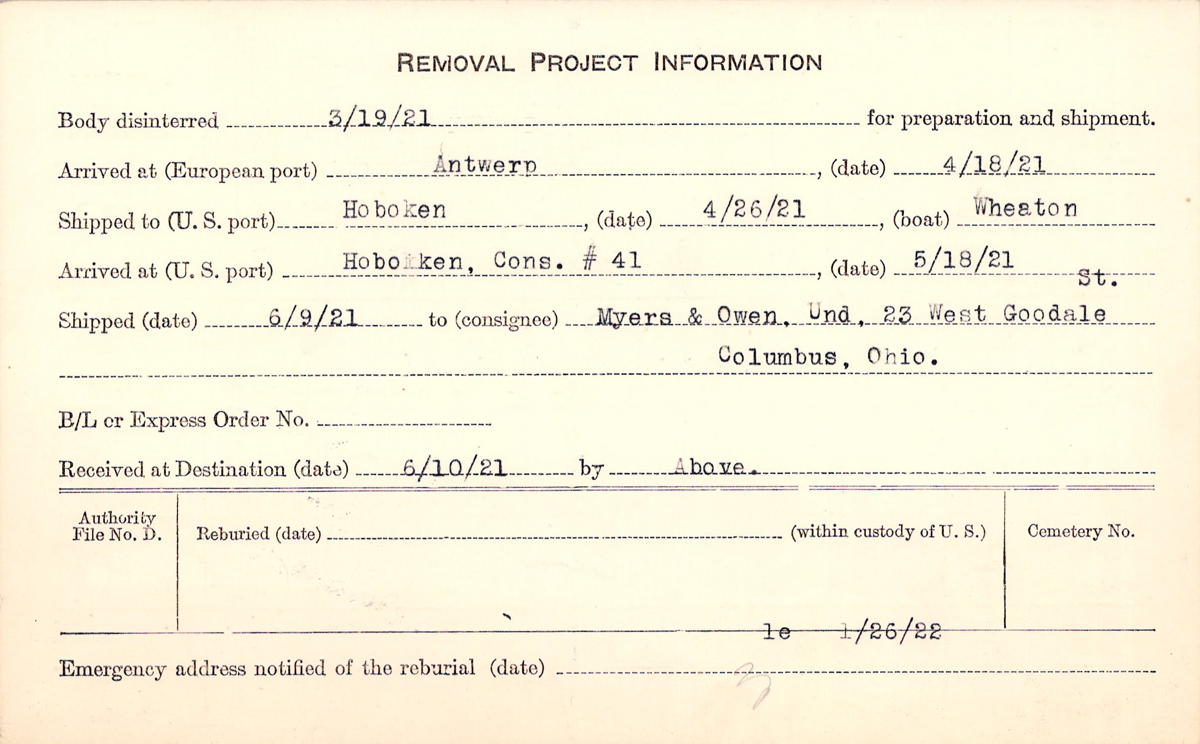 Body disinterred 3/19/1921 for preparation and shipment.