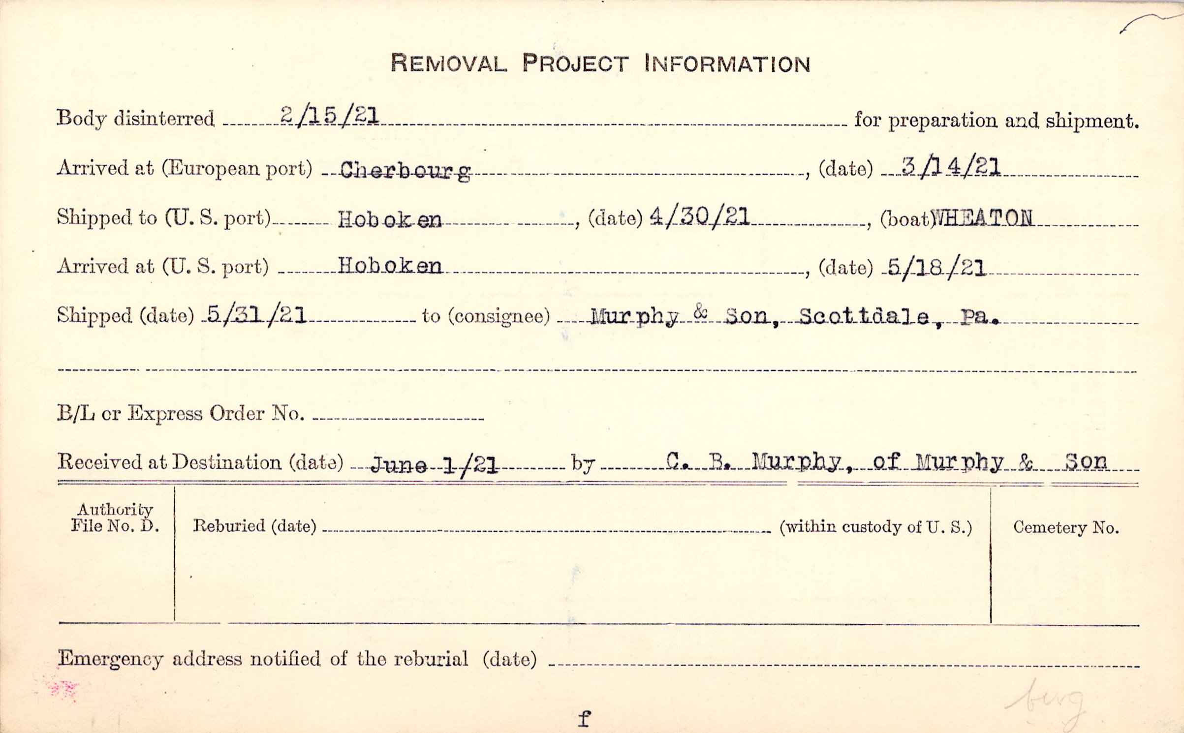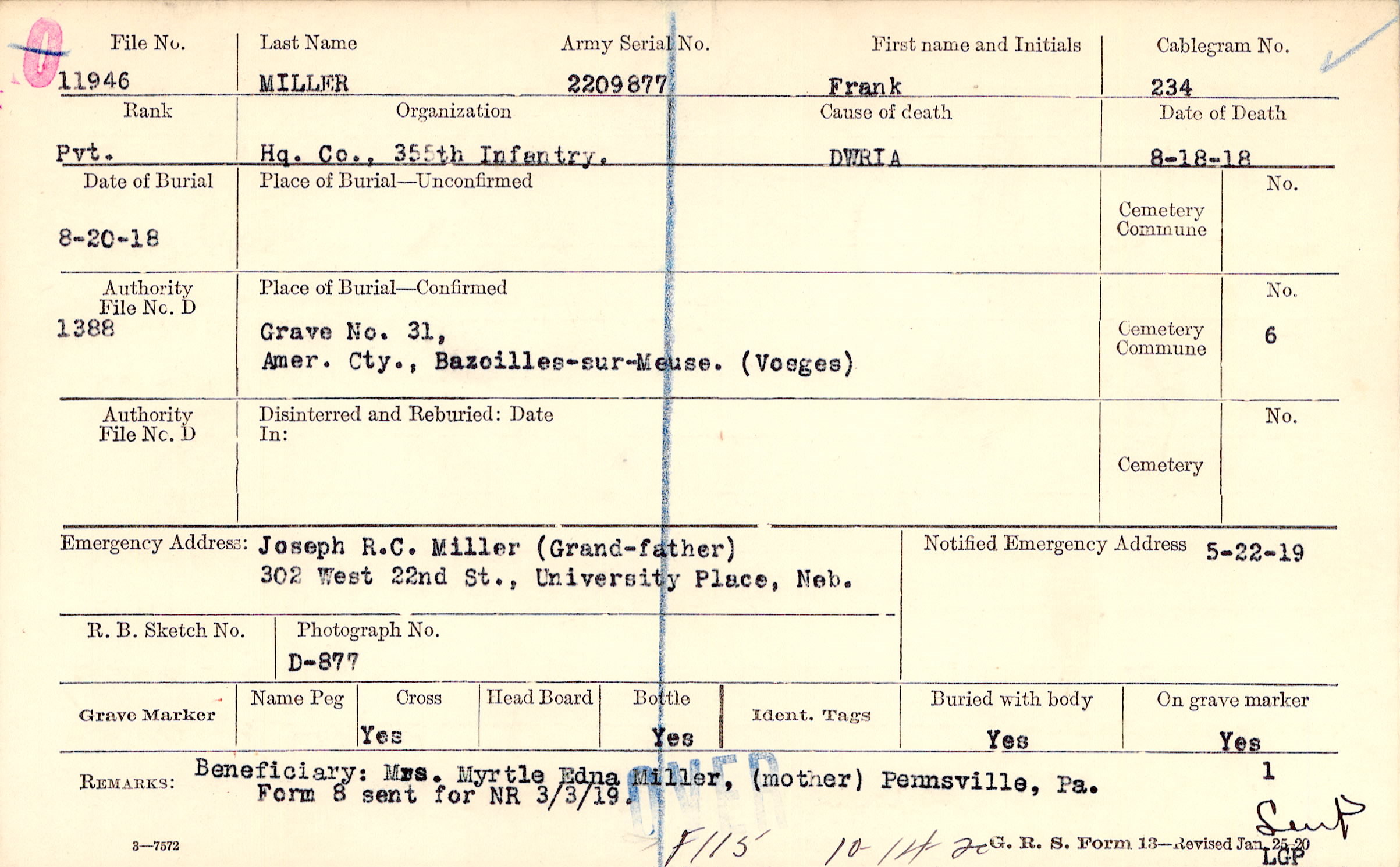 Beneficiary: Mrs. Myrtle Edna Miller, (mother) Pennsville, Pa, Form 8 sent for NR 3/3/19, F115 10-14-20