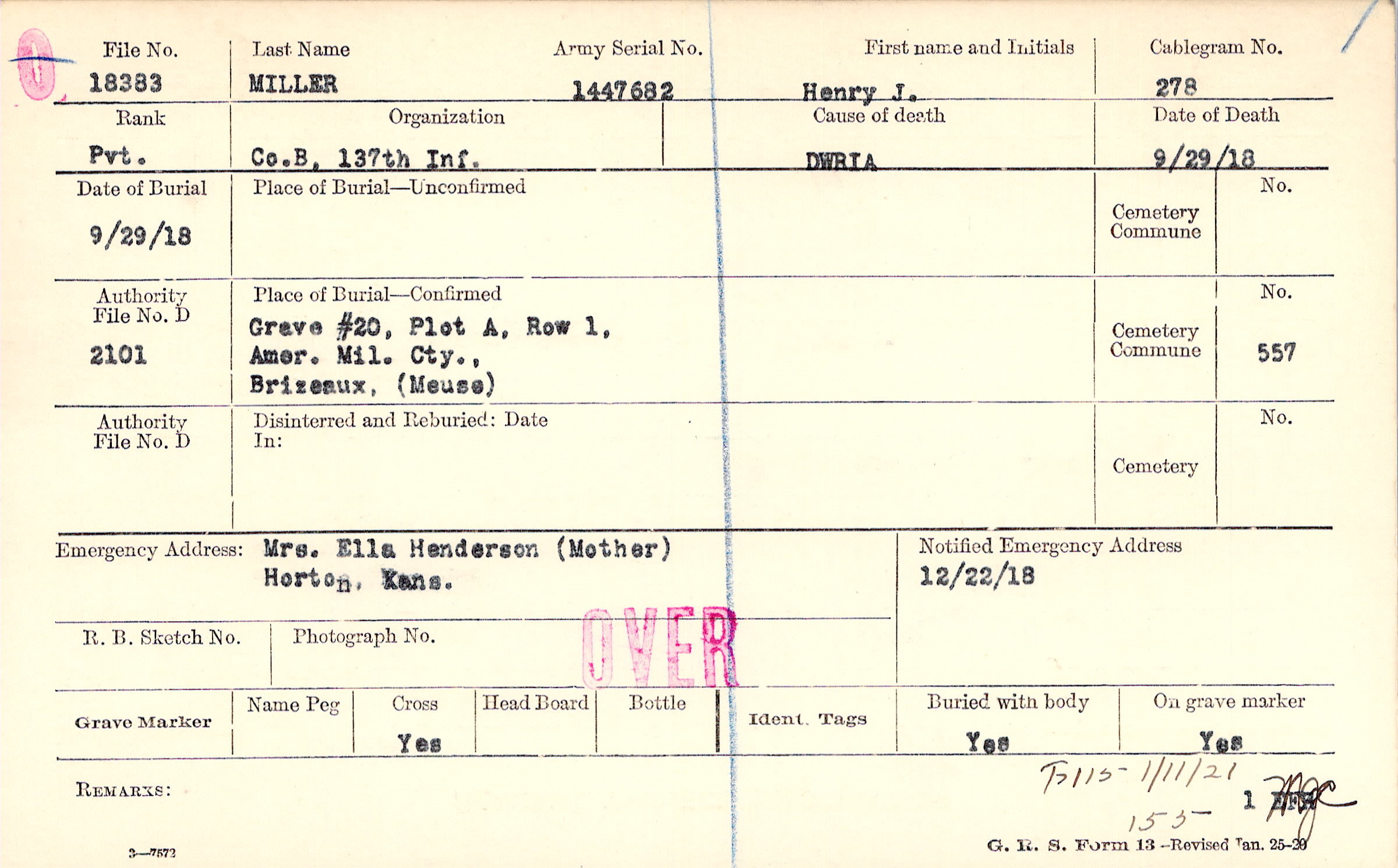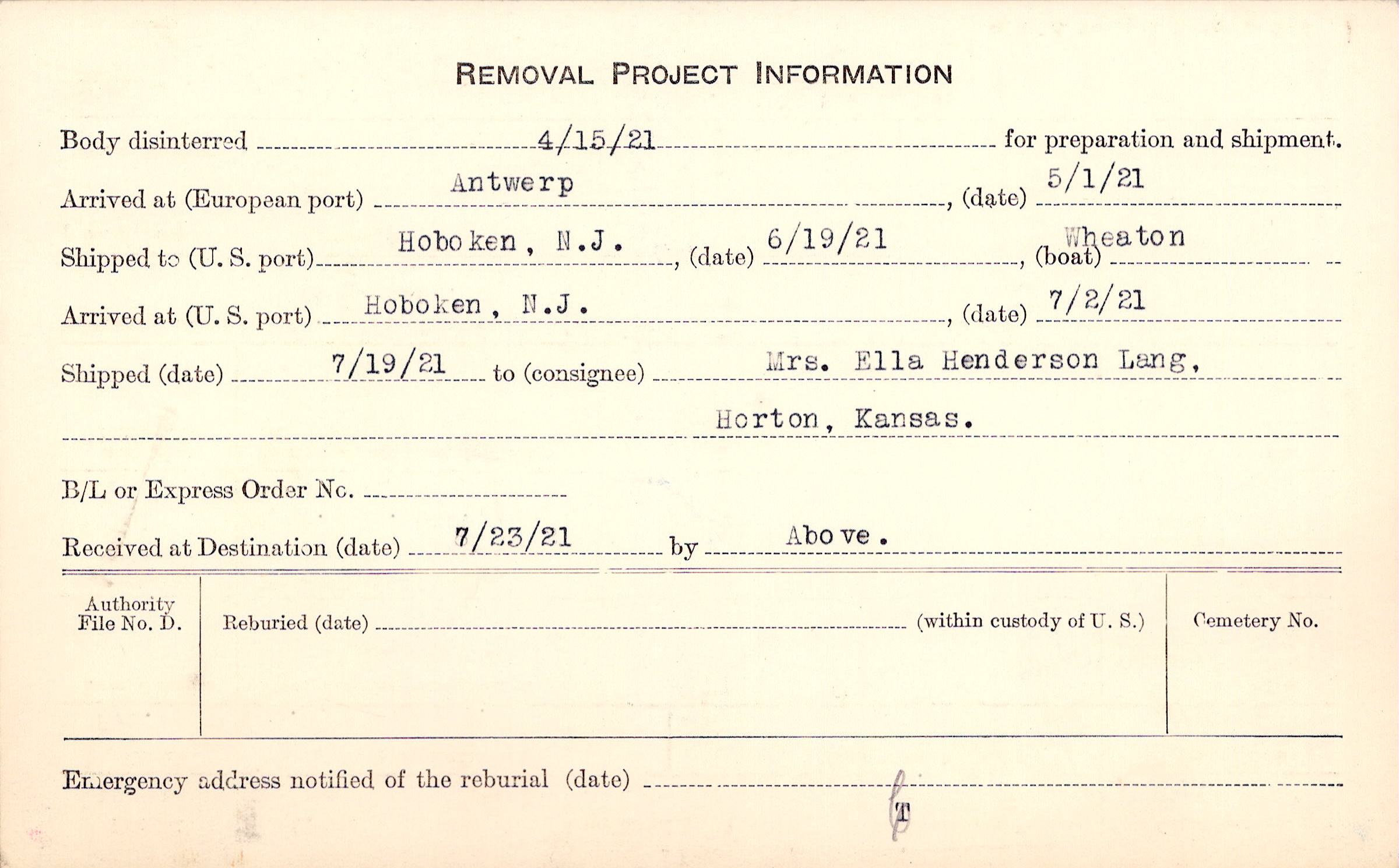 Body disinterred 4/15/1921 for preparation and shipment.