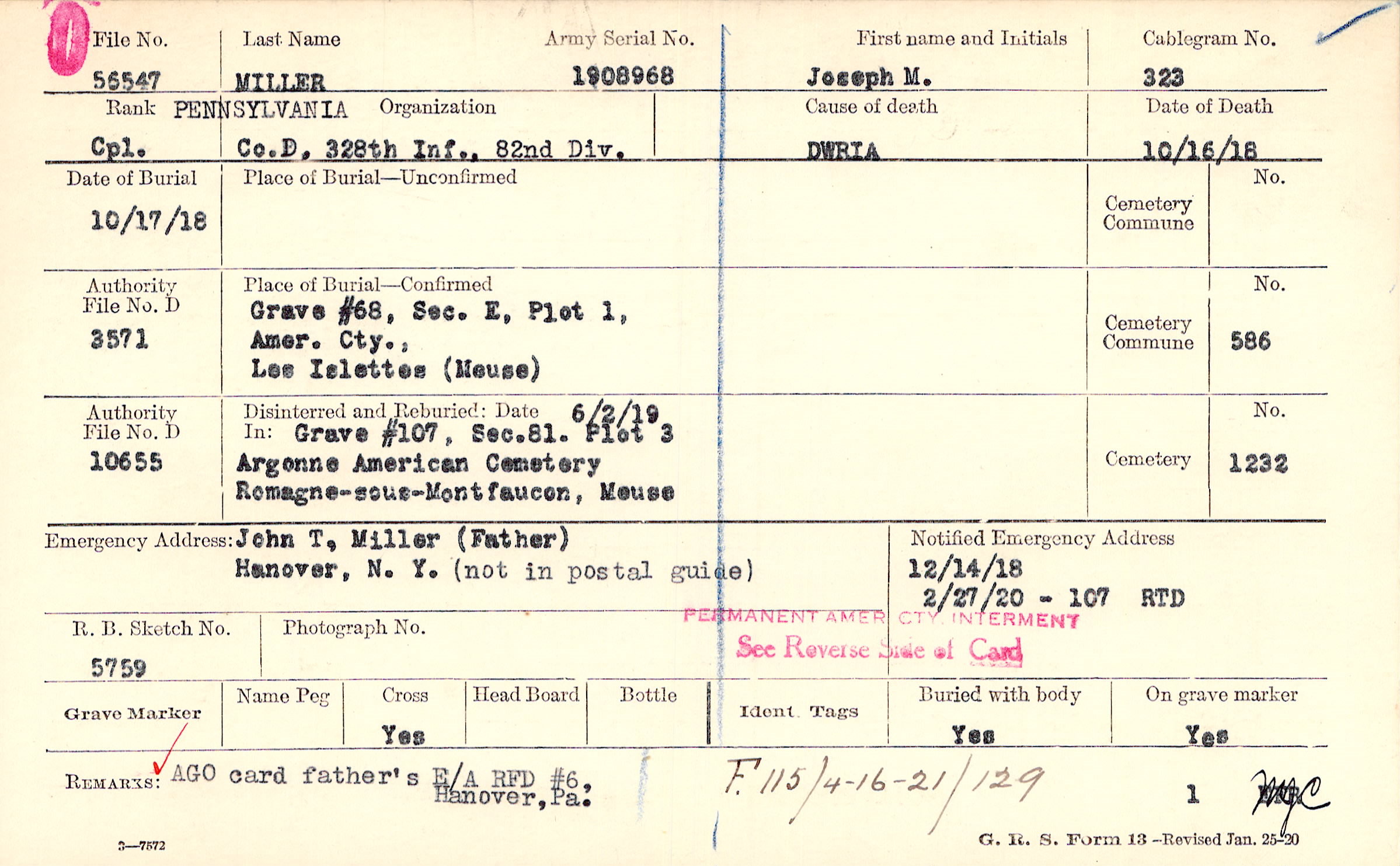 Grave 107, Section 81, Plot 3, Argonne American Cemetery, Romagne-sous-Montfaucon, Meuse