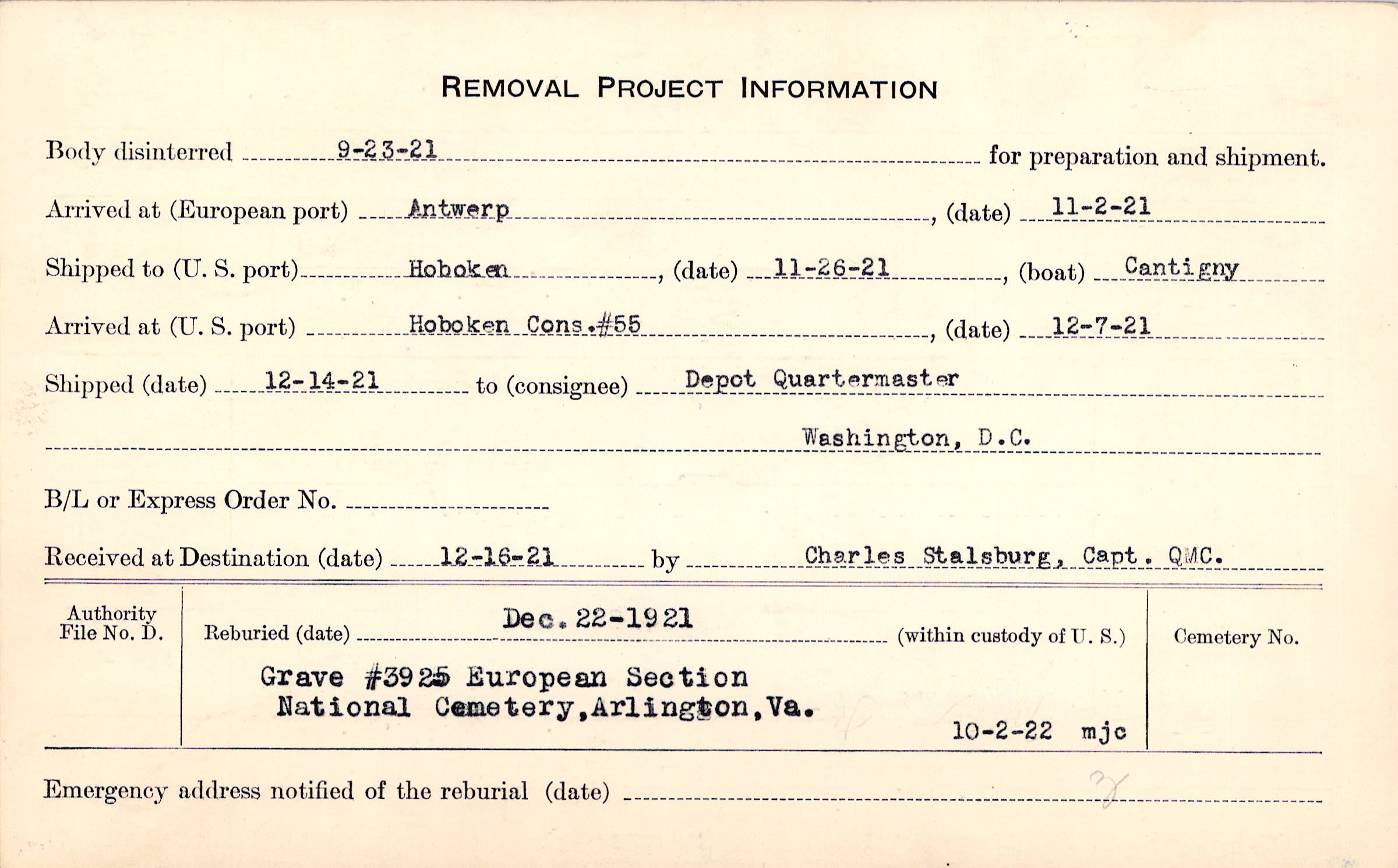 Body disinterred 9/23/1921 for preparation and shipment.