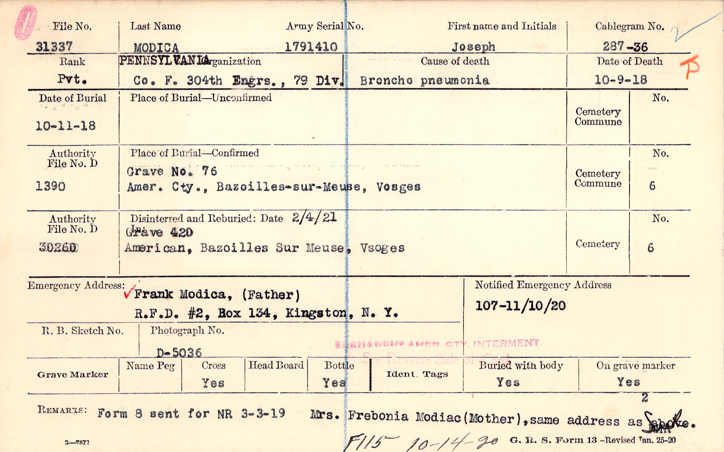 Frank Modica, (Father), R.F.D. #2, Box 134, Kingston, N. Y.