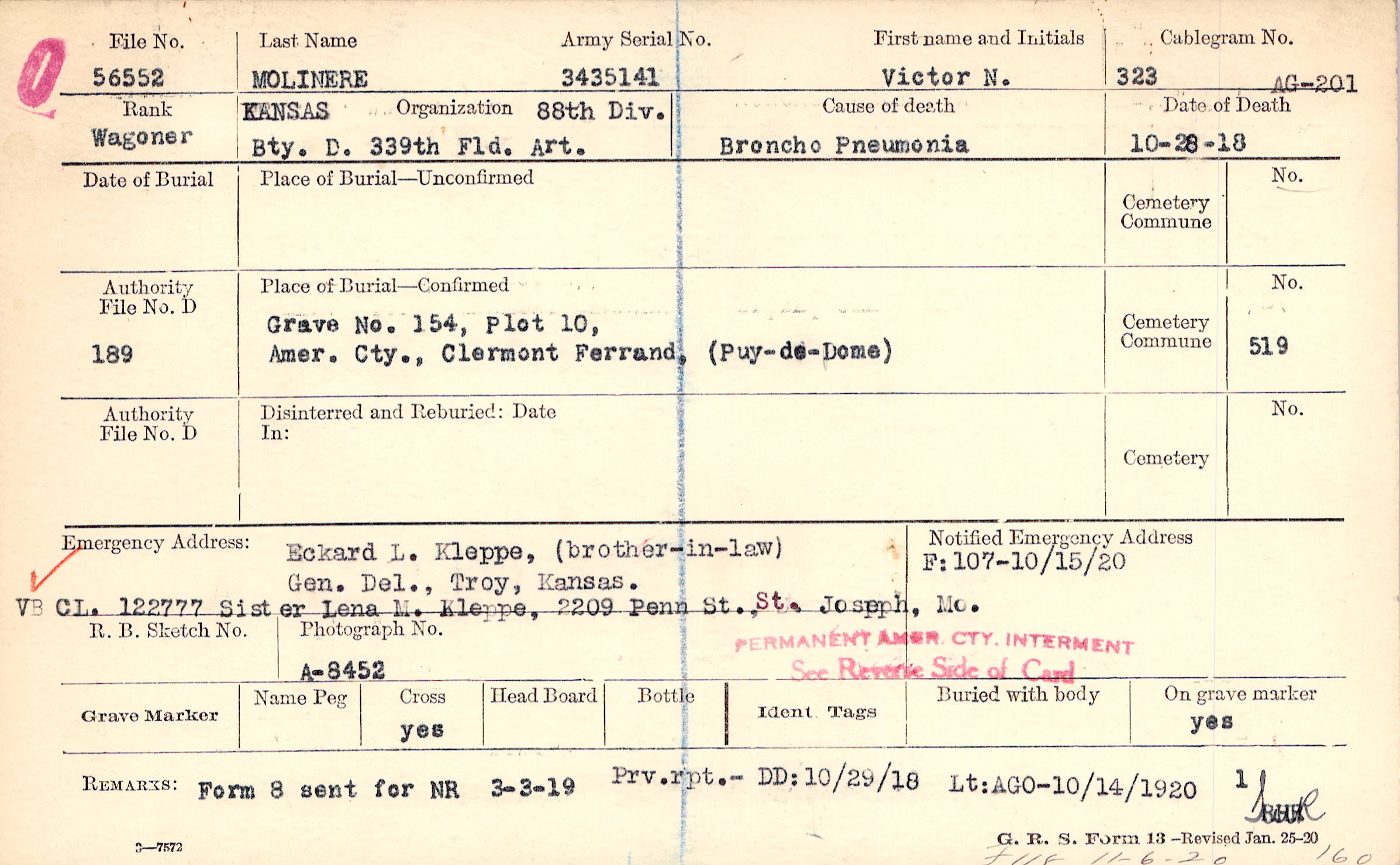 Grave 154, Plot 10, Amer. Cty., Clermont Ferrand, Puy-de-Dome