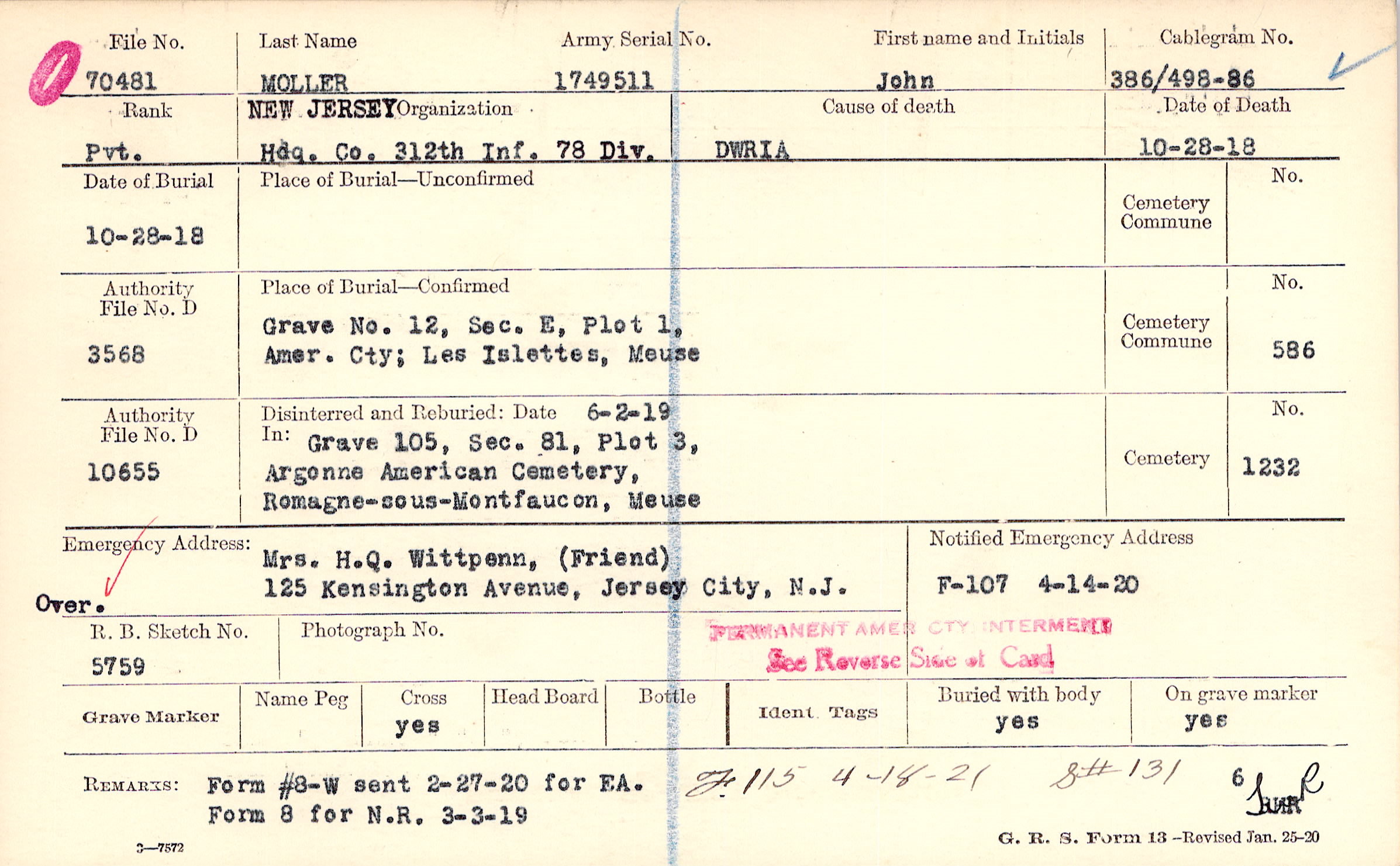 Grave 105, Section 81, Plot 3, Argonne American Cemetery, Romagne-sous-Montfaucon, Meuse