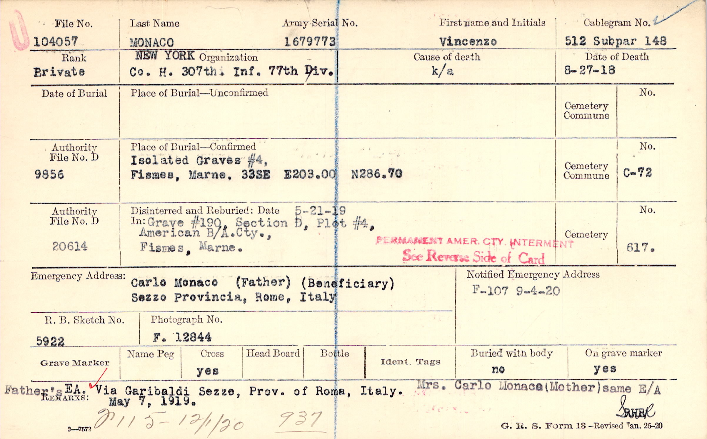 Carlo Monaco (Father), Sezzo Provincia, Rome, Italy, (Beneficiary)