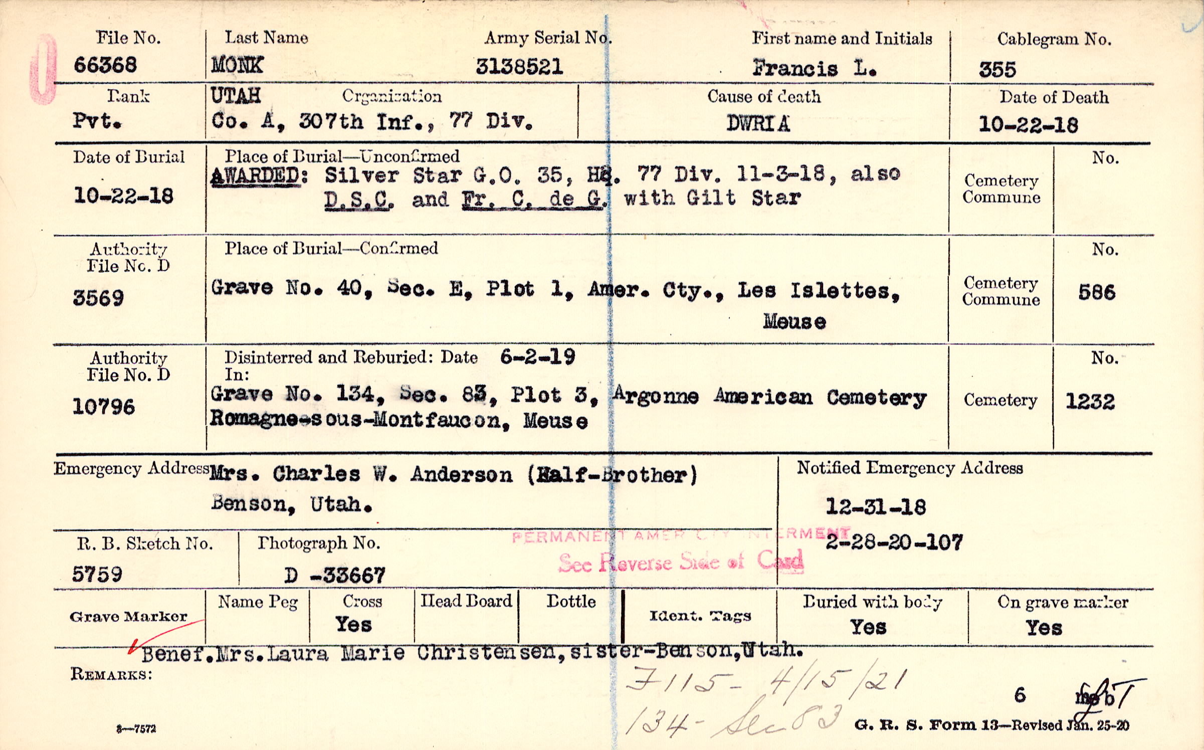 Grave 40, Sec. E, Plot 1, Amer. Cty., Les Islettes, Meuse