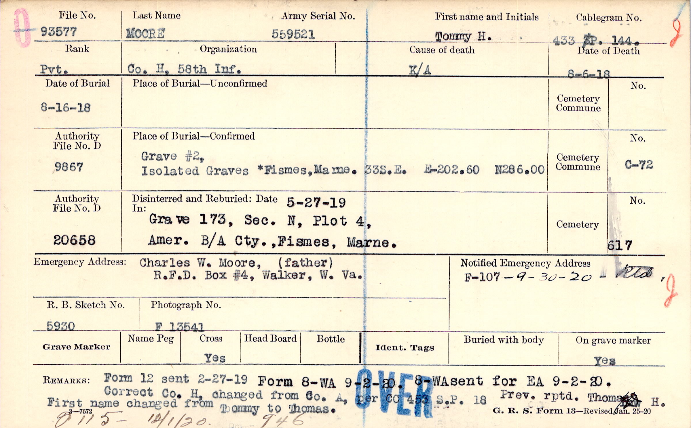 Charles W. Moore, (father), R.F.D. Box #4, Walker, W. Va.