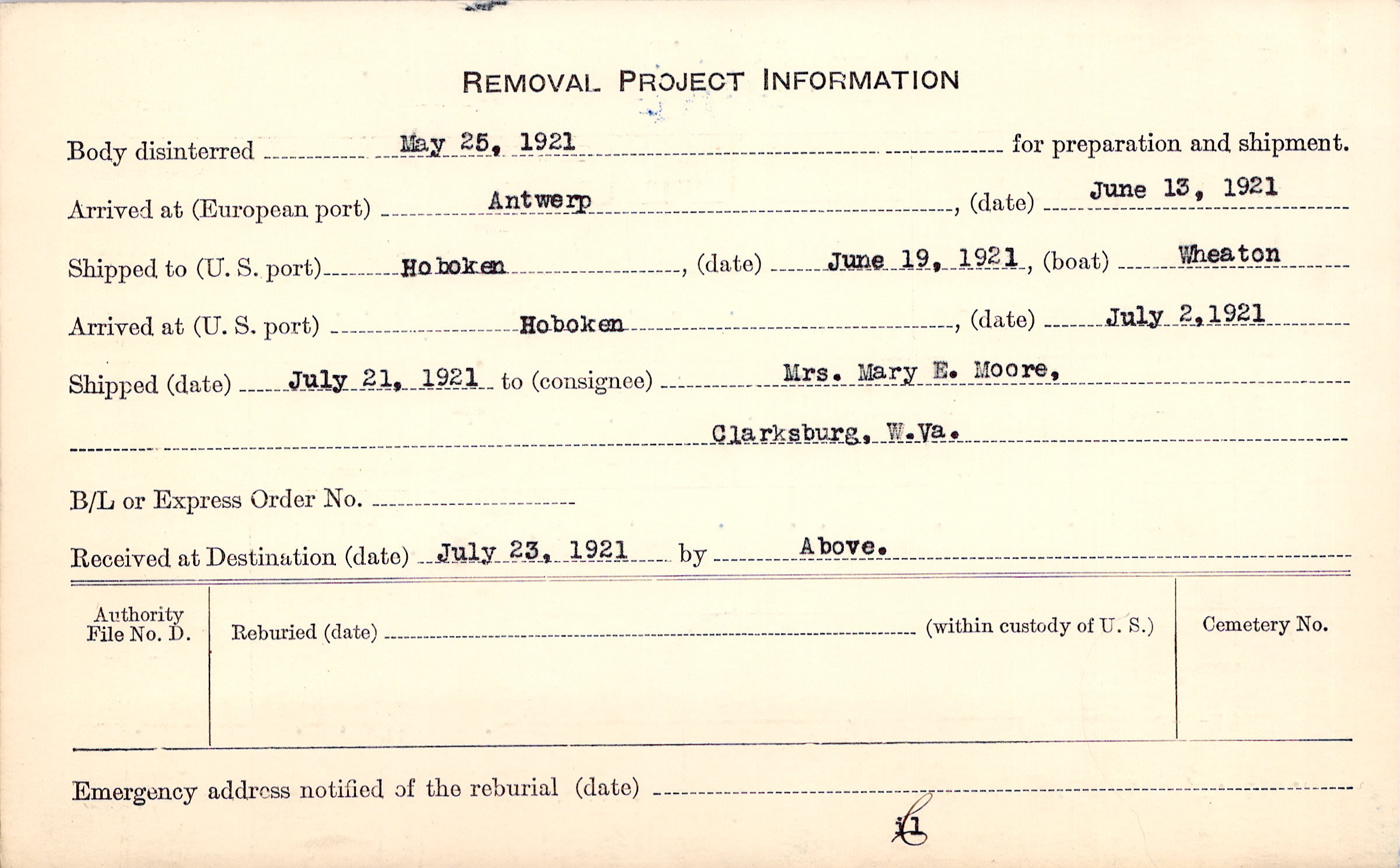 Body disinterred 5/25/1921 for preparation and shipment.