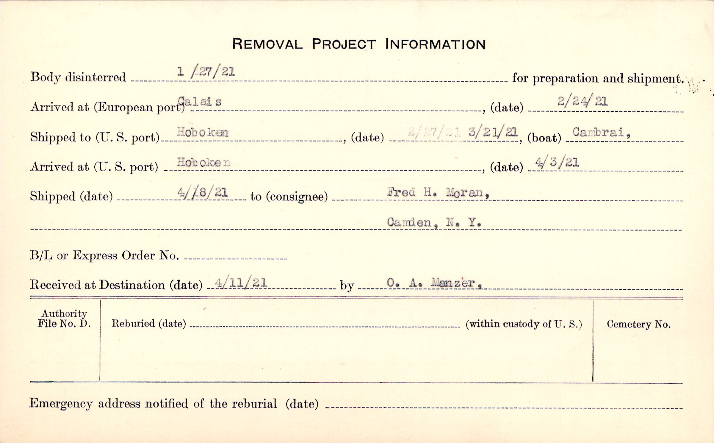 Mrs. F. H. Moran, (Mother), 80 2nd St., Camden, N.Y.
