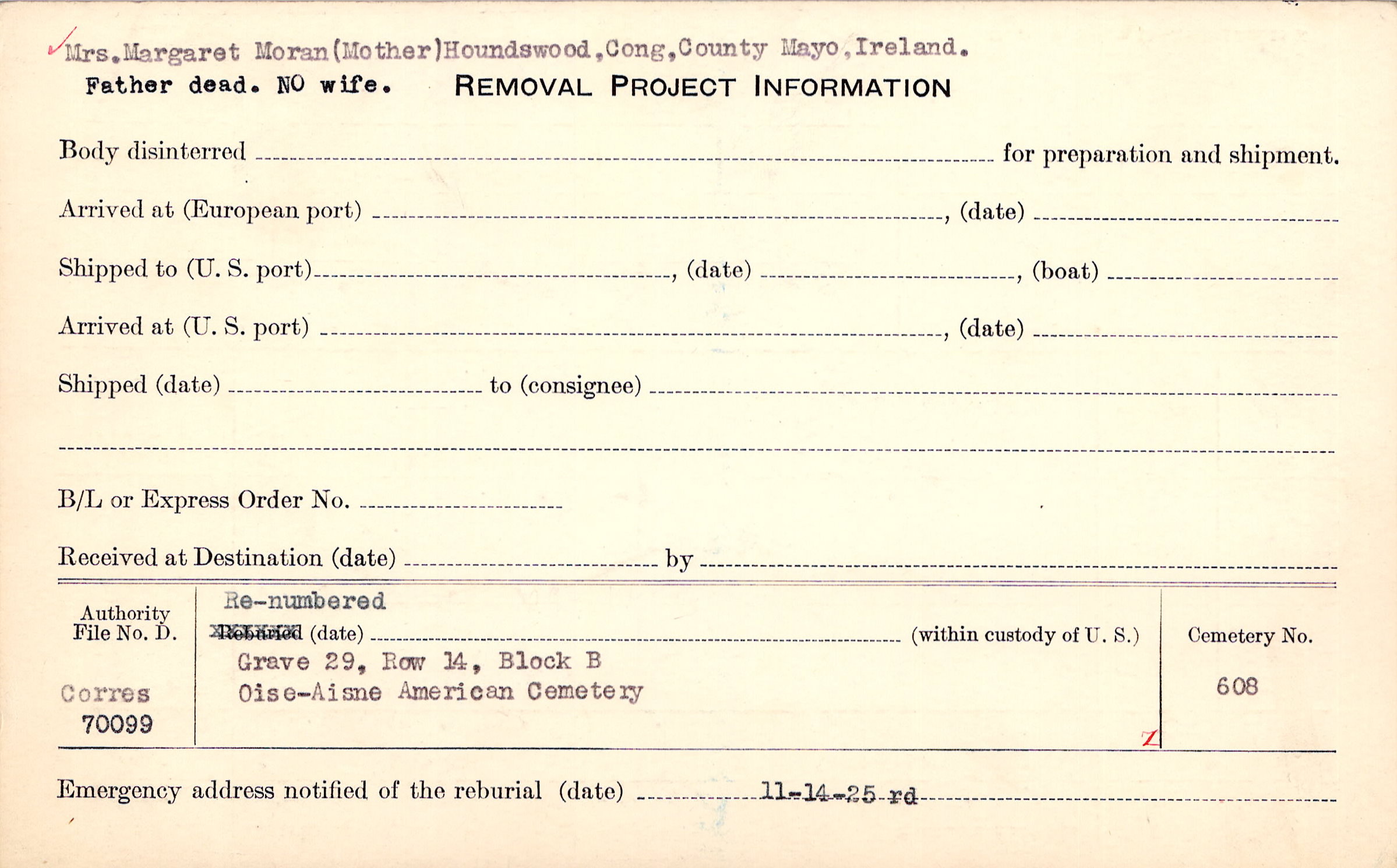 Mrs. Margaret Moran (Mother) Houndswood, Cong. County Mayo, Ireland. Father dead. NO wife. |
