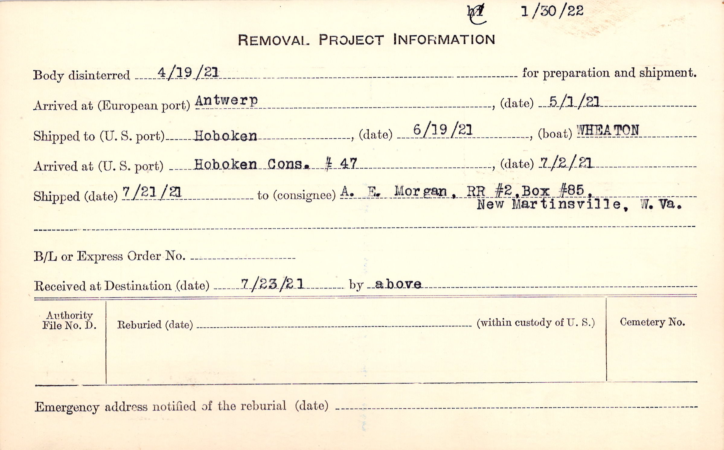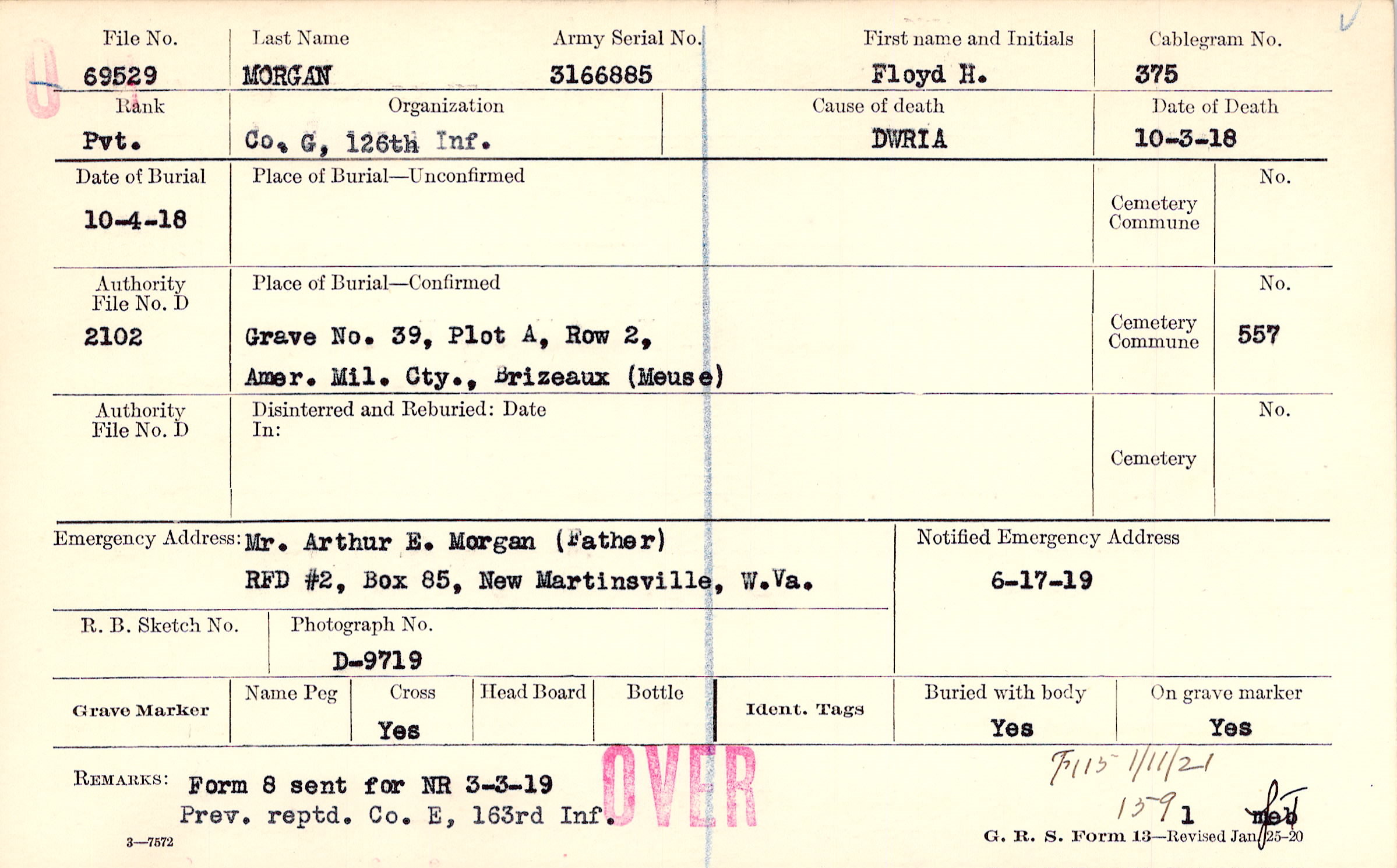 Mr. Arthur E. Morgan (Father), RFD #2, Box 85, New Martinsville, W.Va., Form 8 sent for NR 3-3-19 Prev. reptd. Co. E., 163rd Inf.