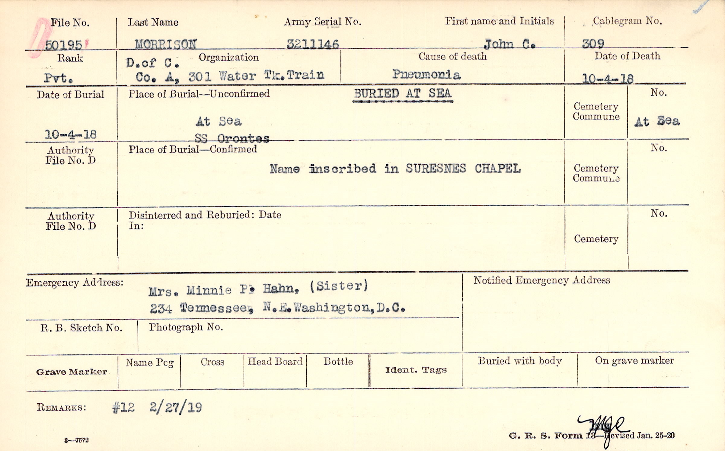 Mrs. Minnie P. Hahn, (Sister), 234 Tennessee, N.E. Washington, D.C.