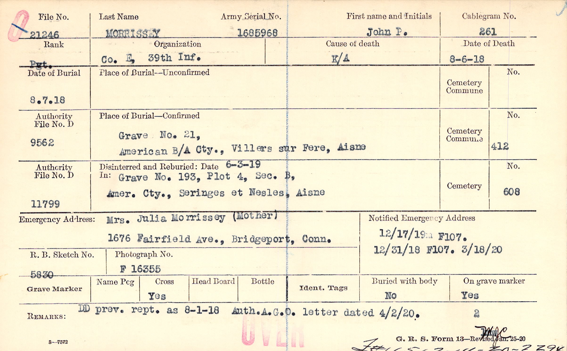 Mrs. Julia Morrissey (Mother), 1676 Fairfield Ave., Bridgeport, Conn.