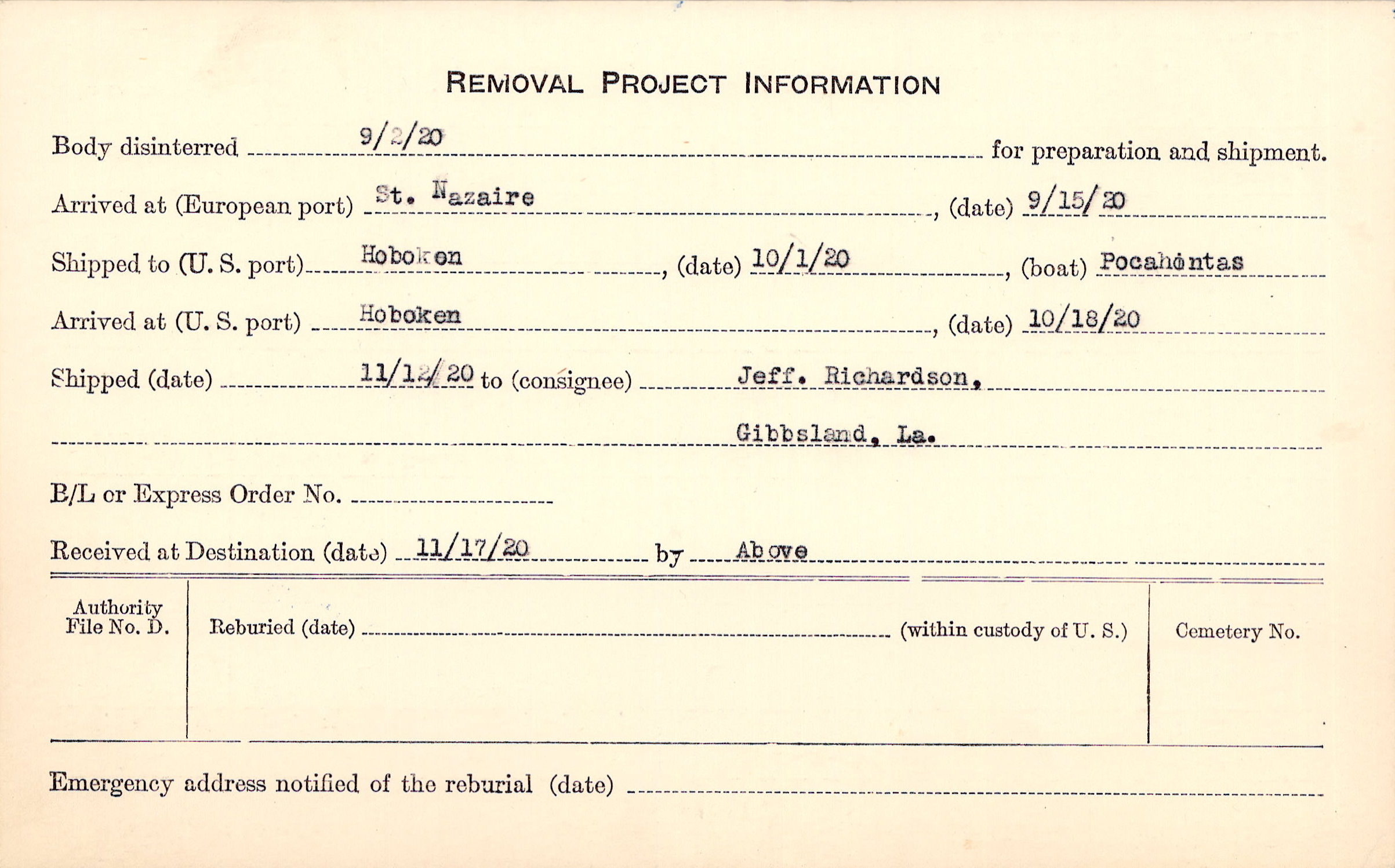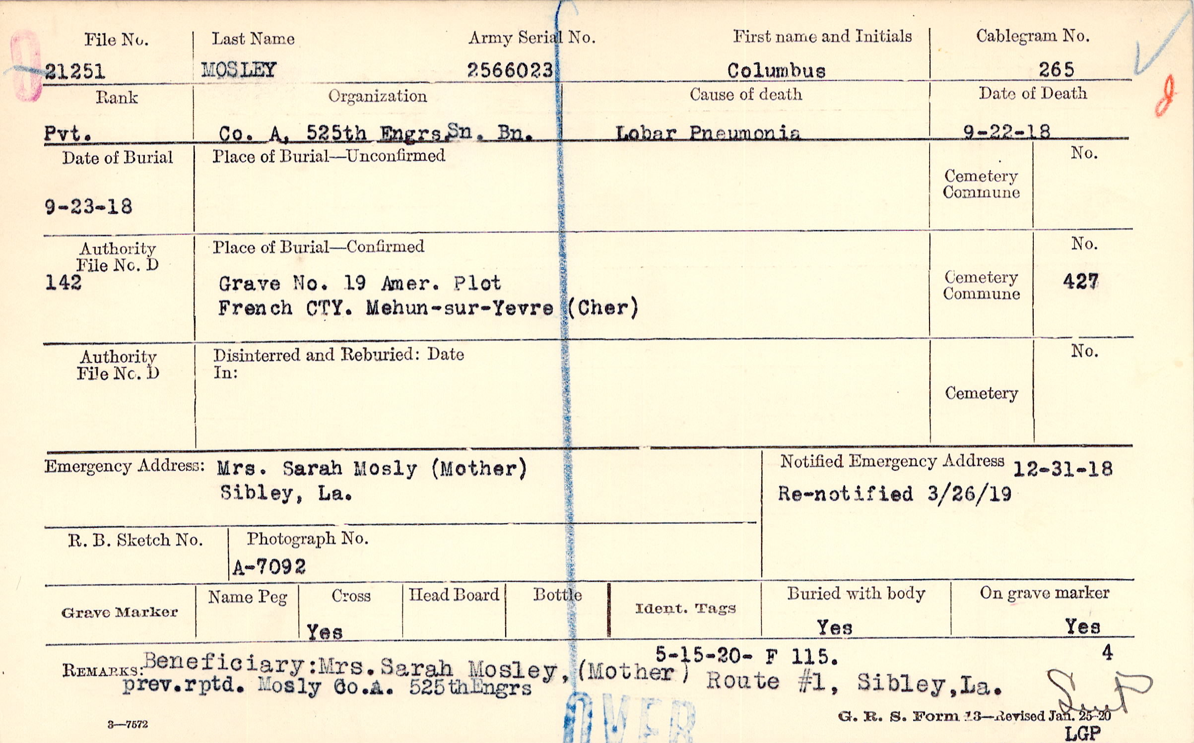 Beneficiary: Mrs. Sarah Mosley, (Mother) Route #1, Sibley, La. prev. rptd. Mosly Co. A. 525th Engrs, 5-15-20- F 115.
