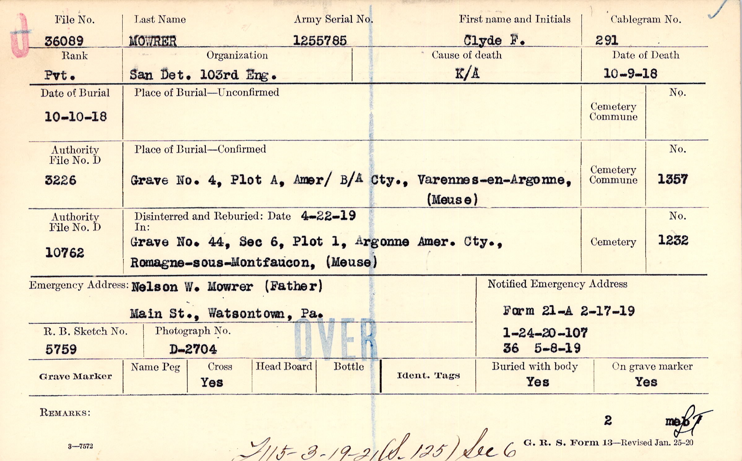 Grave 4, Plot A, Amer/ B/A Cté., Varennes-en-Argonne, Meuse.