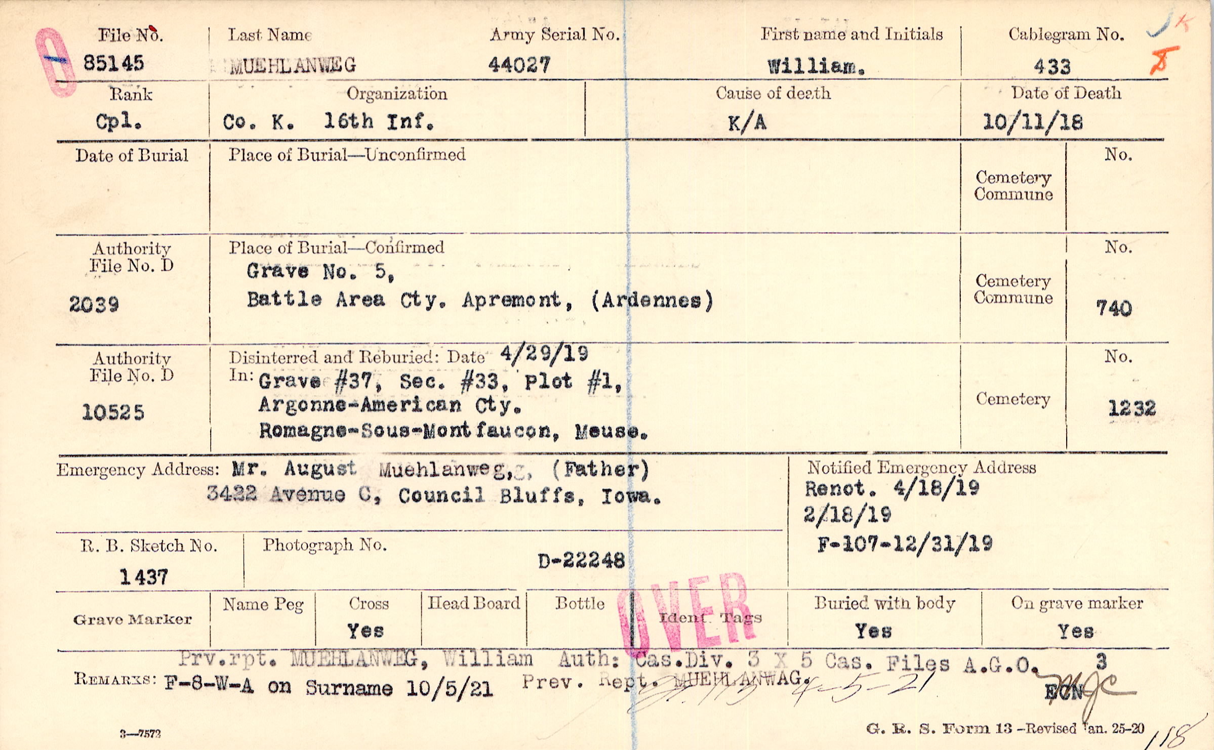 Mr. August Muehlanweg, (Father), 3422 Avenue C, Council Bluffs, Iowa.