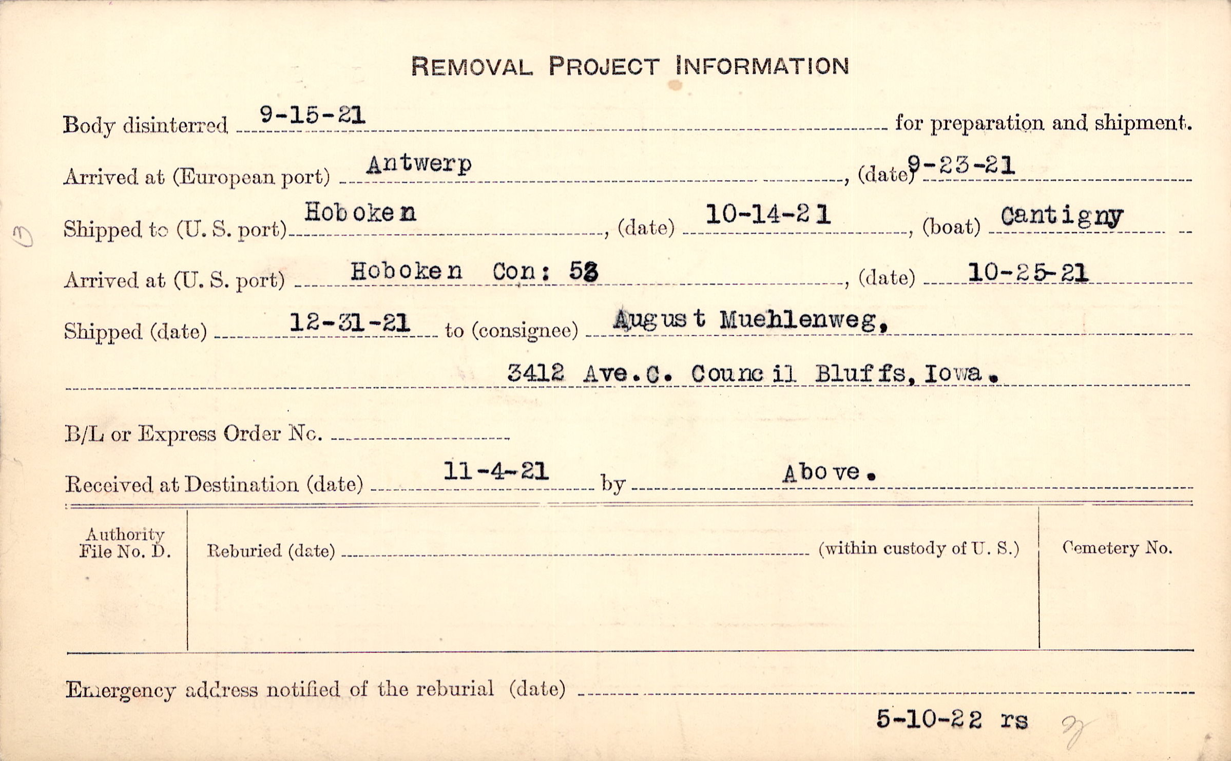 Body disinterred 9/15/1921 for preparation and shipment.