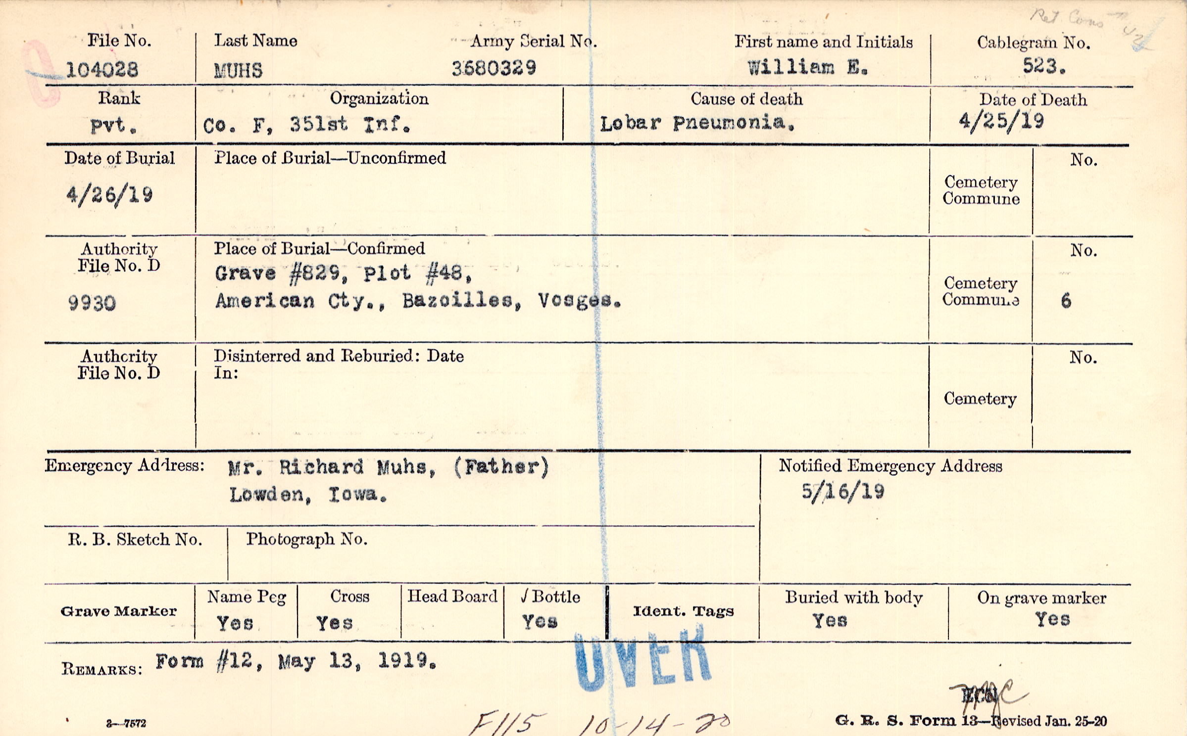 Grave #829, Plot #48,American Cty., Bazoilles, Vosges.