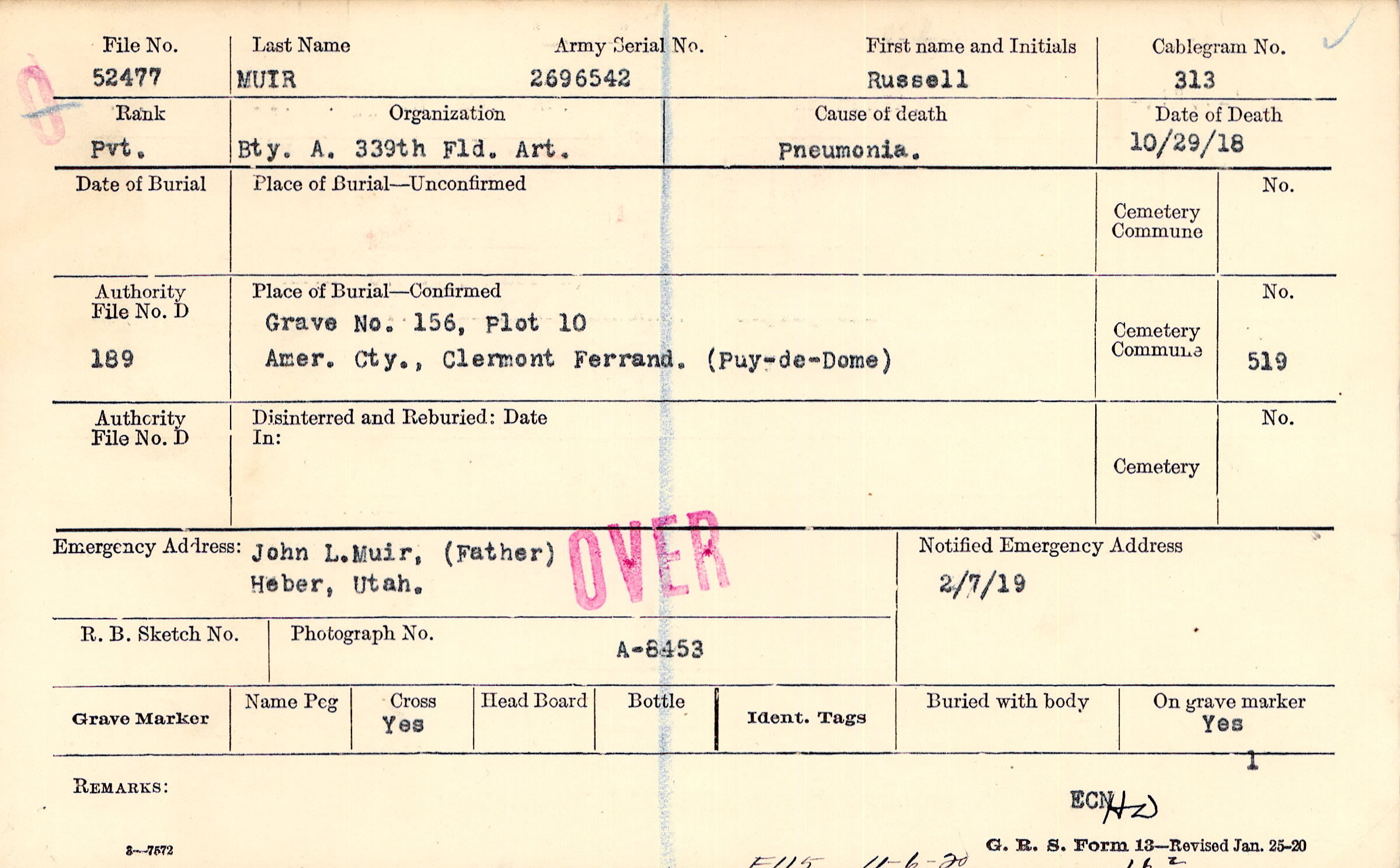 Grave 156, Plot 10, Amer. Cty., Clermont Ferrand. (Puy-de-Dome)