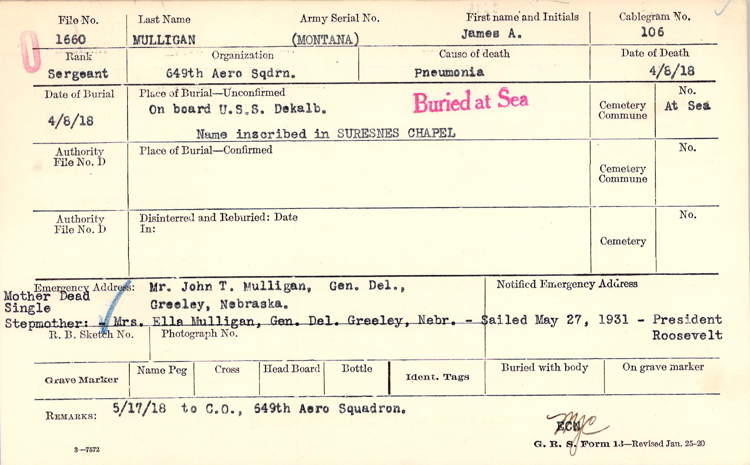 On board U. S. S. DeKalb.,Name inscribed in SURESNES CHAPEL