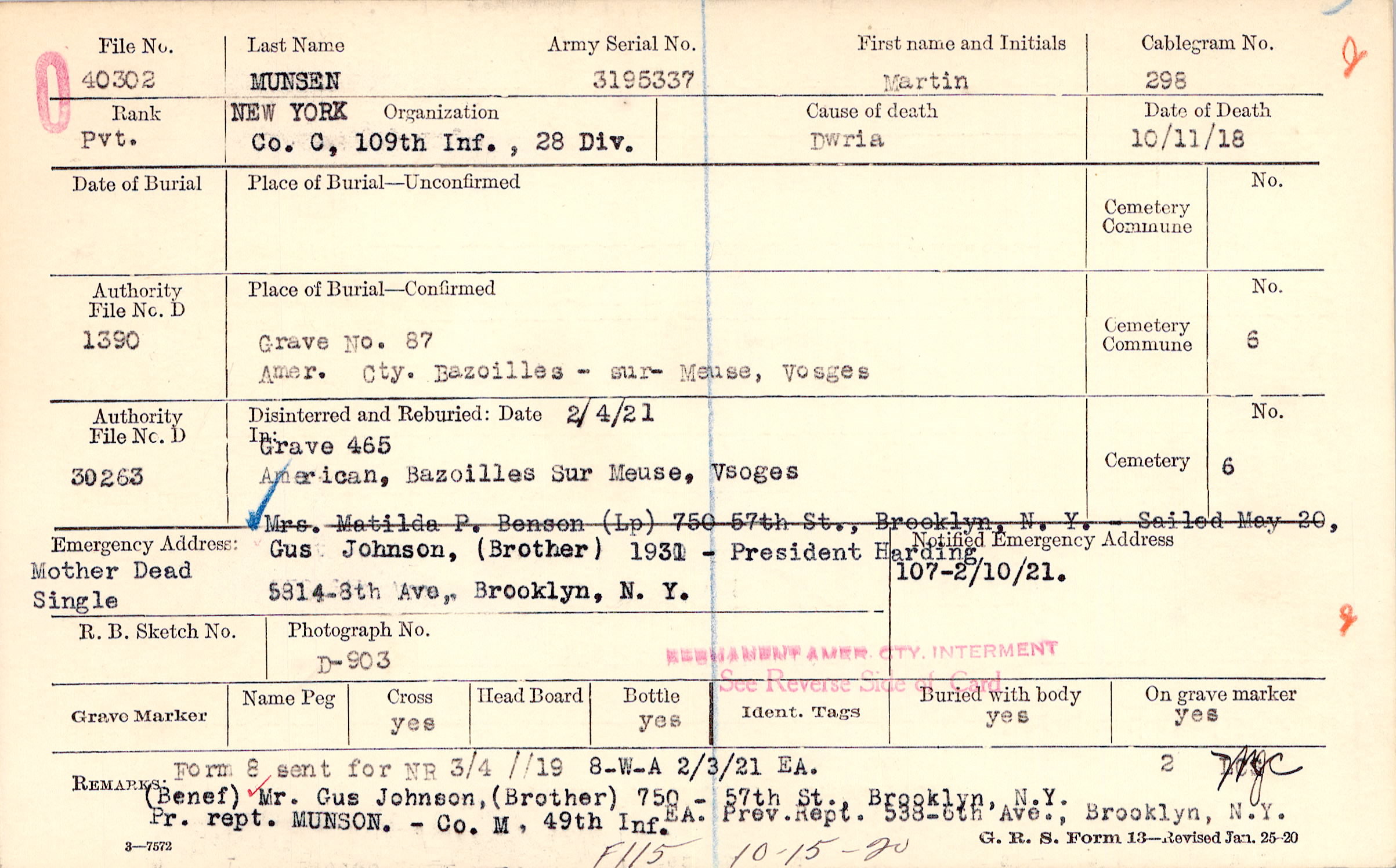 (Benef) Mr. Cus Johnson (Brother) 750- 57th St., Brooklyn, N.Y. EA. prev.rept. 538-6th Ave., Brooklyn, N.Y. Prev. rept. MUNSON. - Co. M, 49th Inf., Form 8 sent for NR 3/4//19 8-W-A 2/31/21 EA., F115 10-15-20