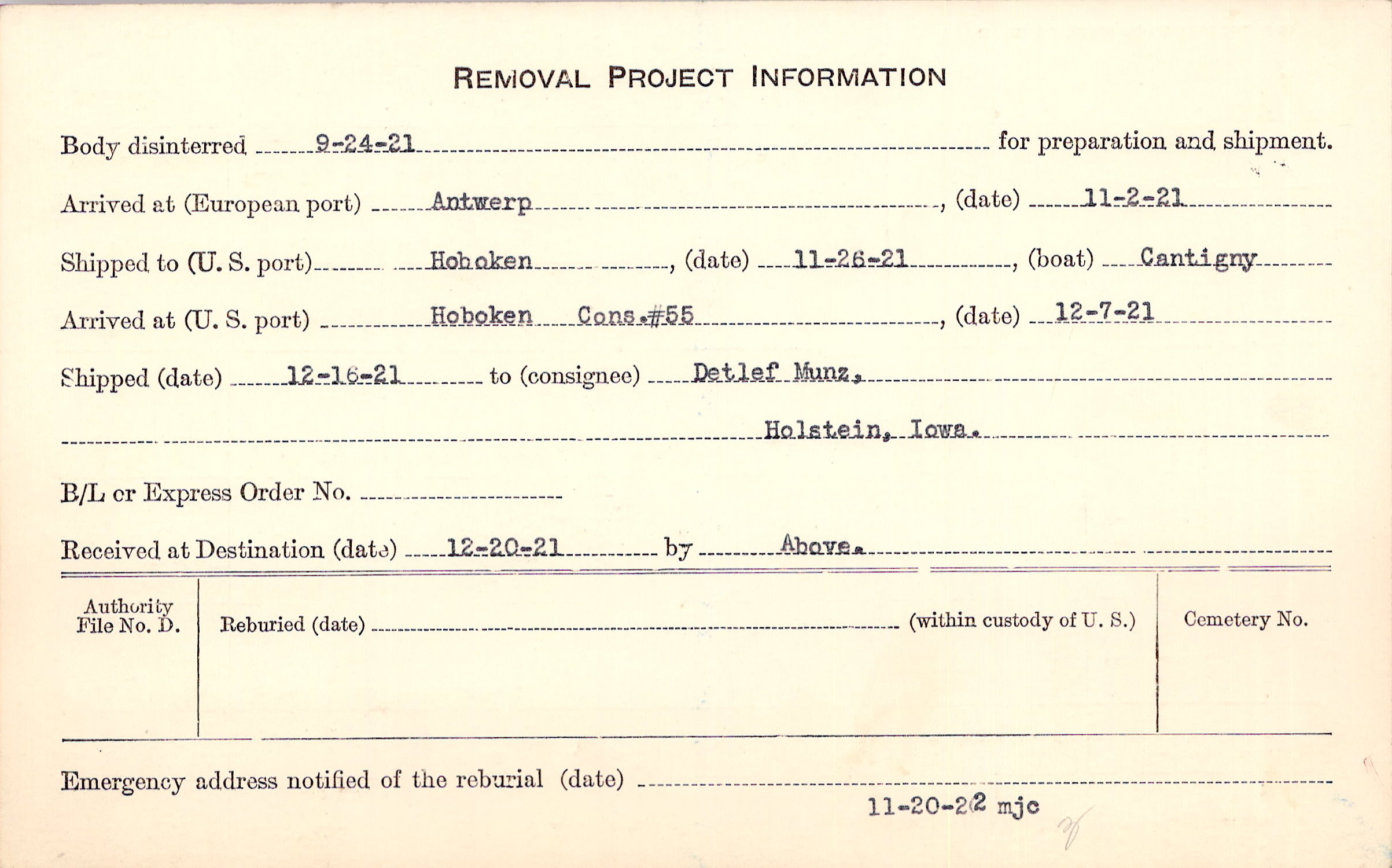 Body disinterred 9/24/1921 for preparation and shipment.