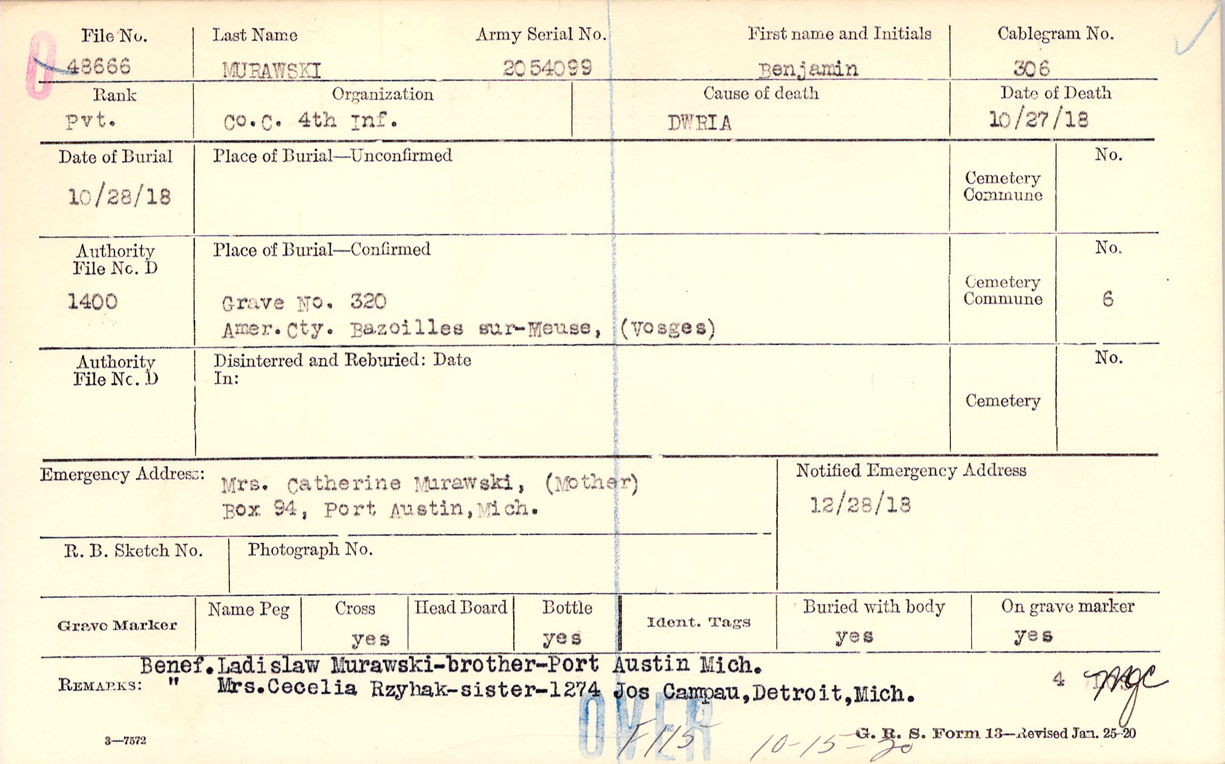 Mrs. Catherine Murawski, (Mother), Box 94, Port Austin, Mich.