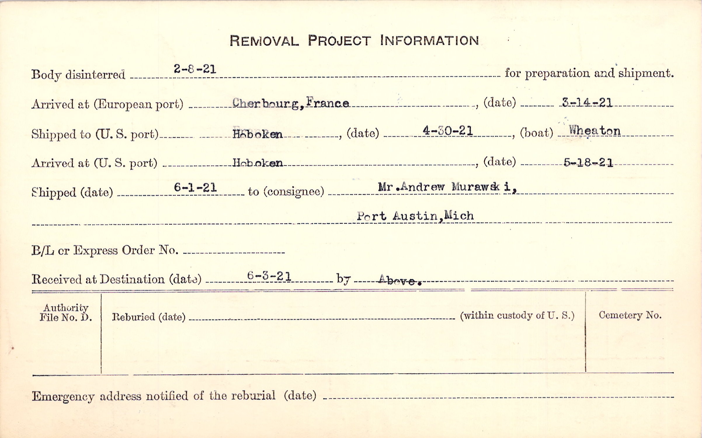 Body disinterred 2/8/1921 for preparation and shipment.