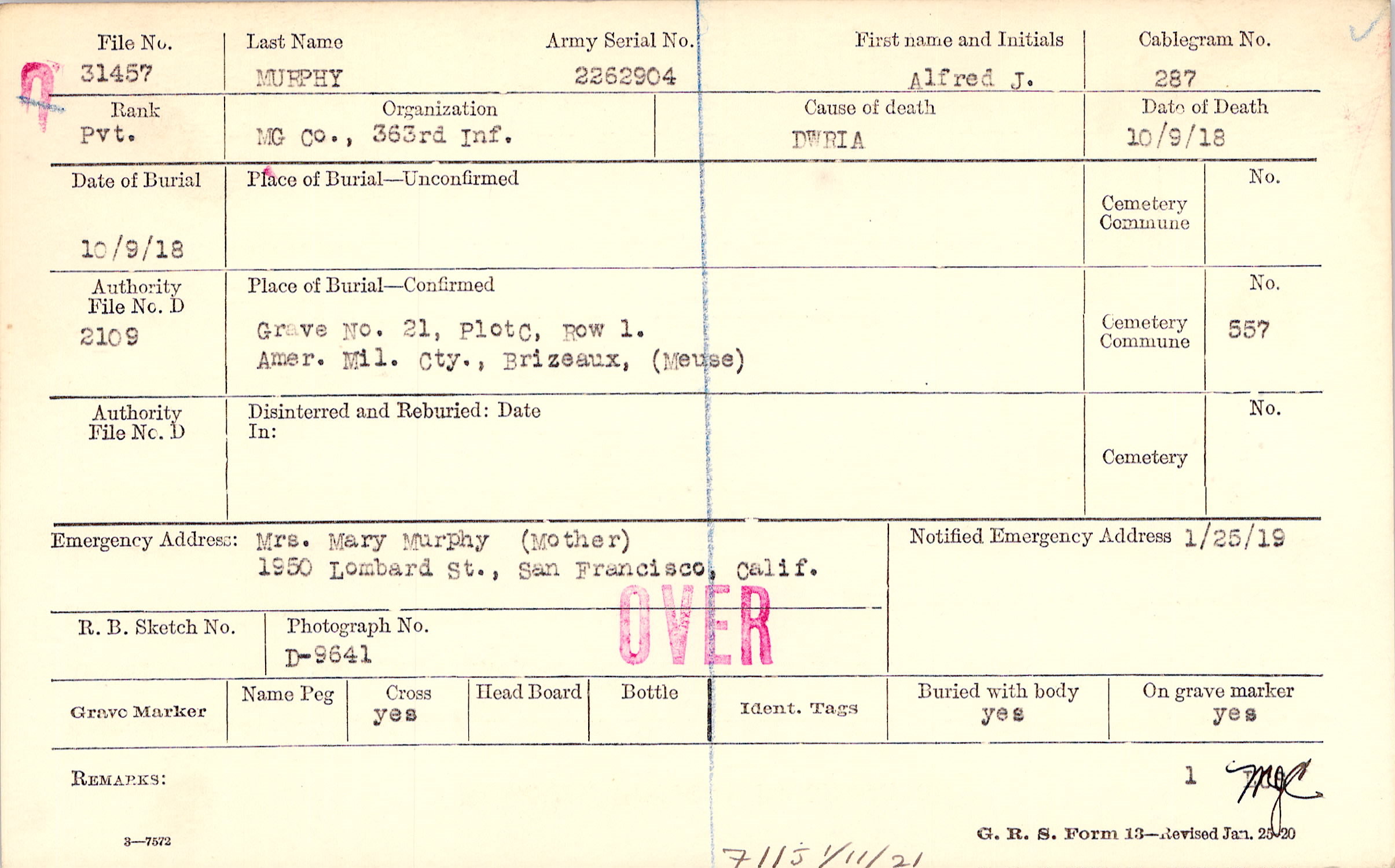 Mrs. Mary Murphy (Mother), 1950 Lombard St., San Francisco, Calif.