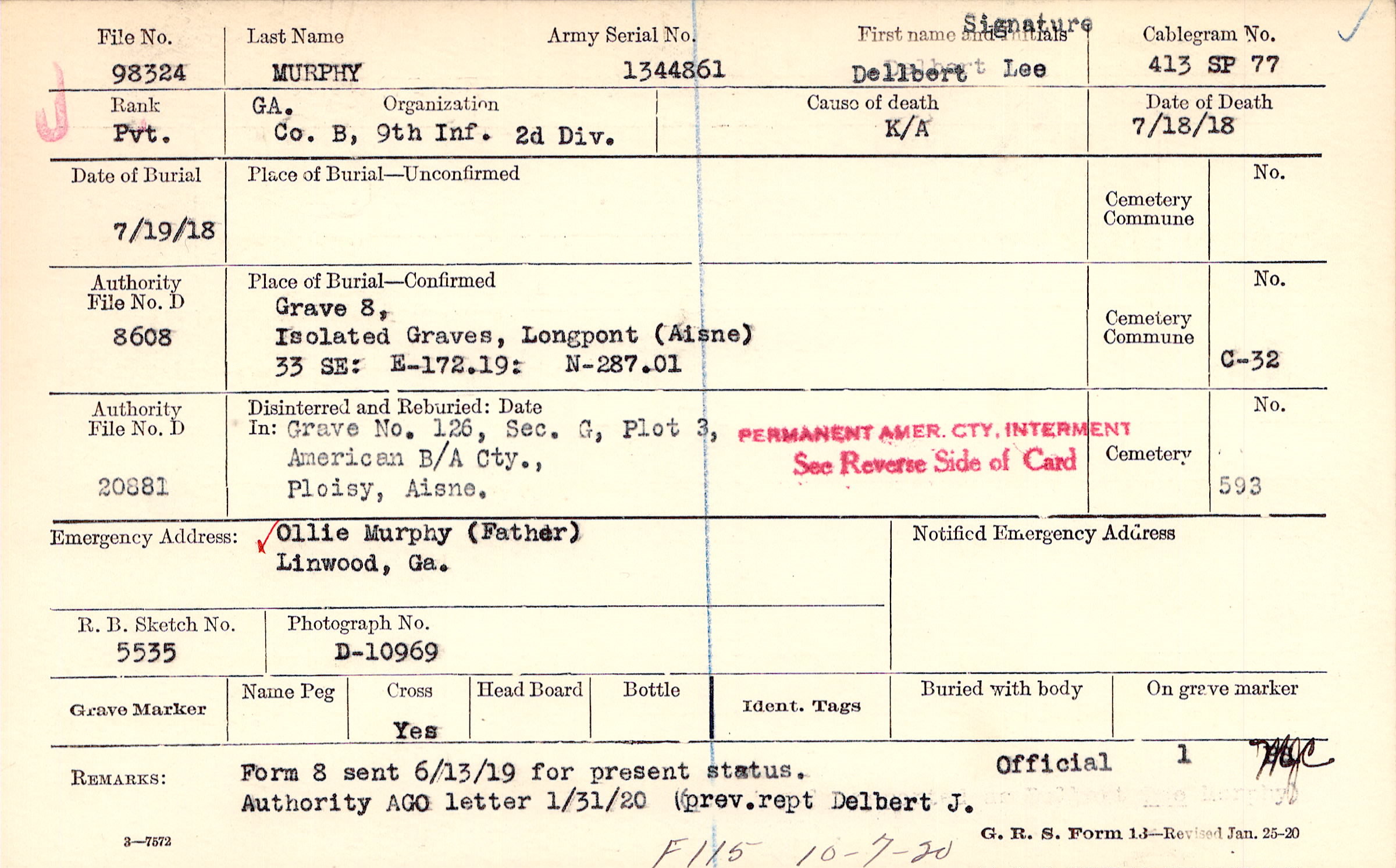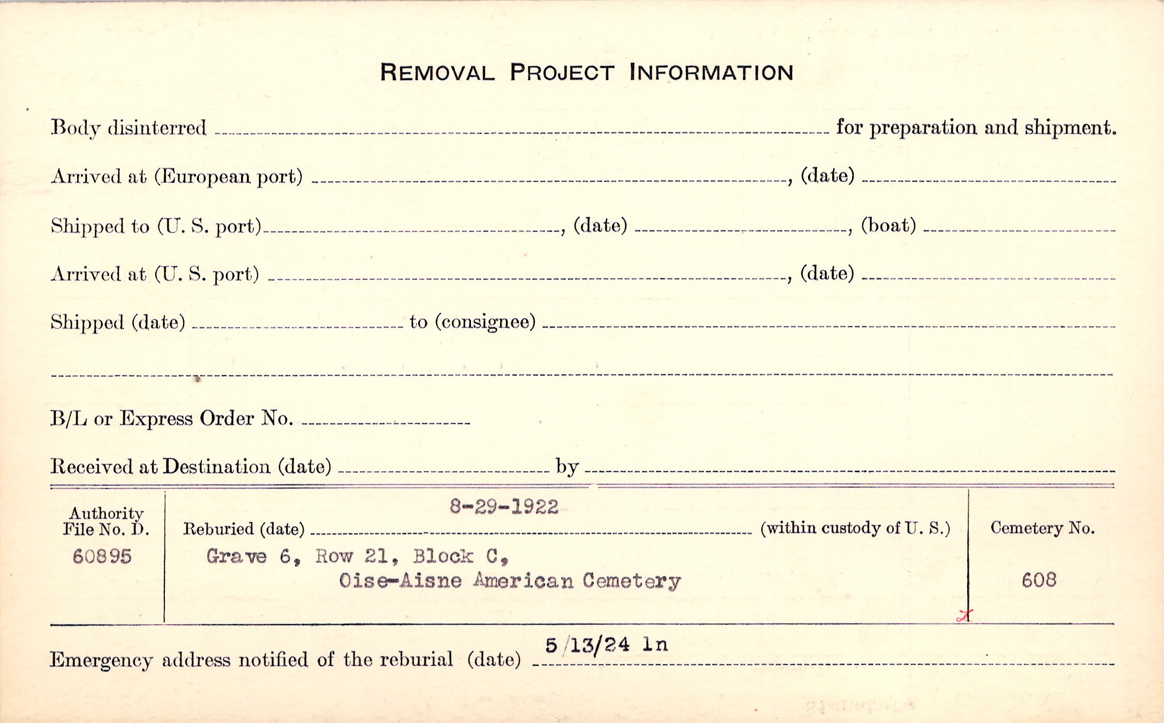 Grave 126, Section G, Plot 3, American B/A Cemetery, Ploisy, Aisne