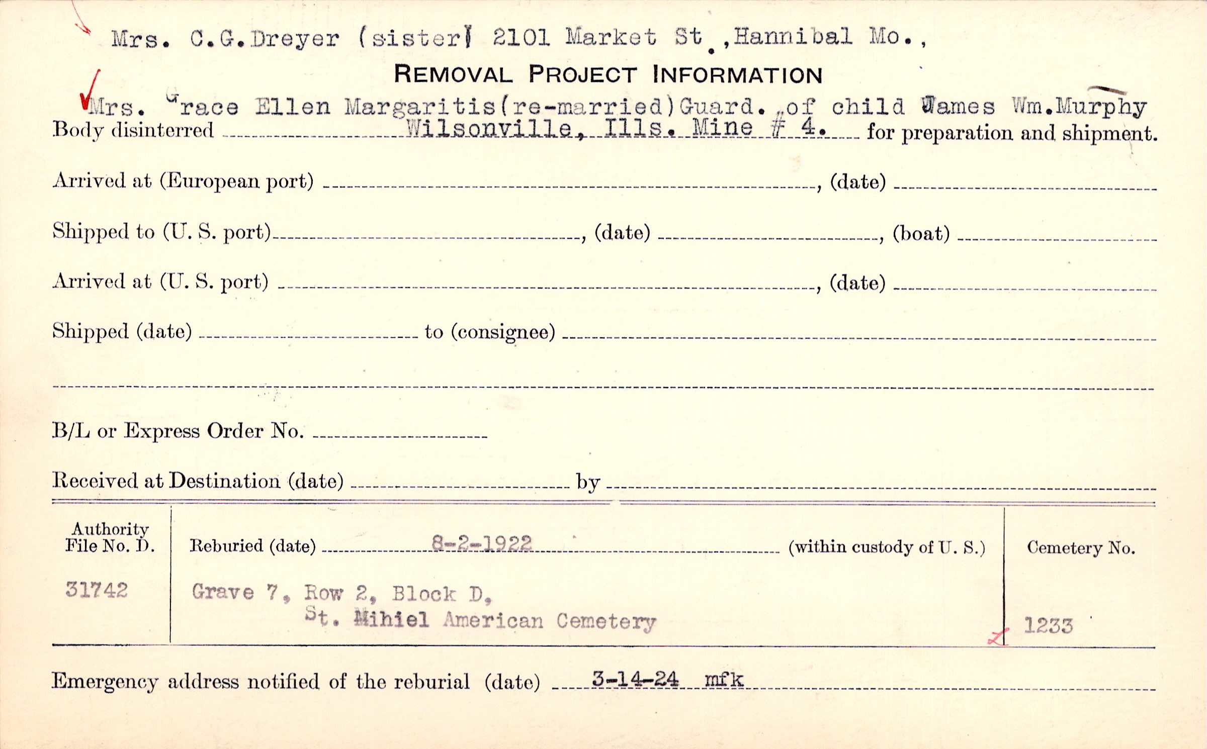 Mrs. C.G.Dreyer (sister) 2101 Market St., Hannibal Mo. Mrs. Grace Ellen Margaritis (re-married) Guard. of child James Wm. Murphy Wilsonville, Ills. Mine #4. |