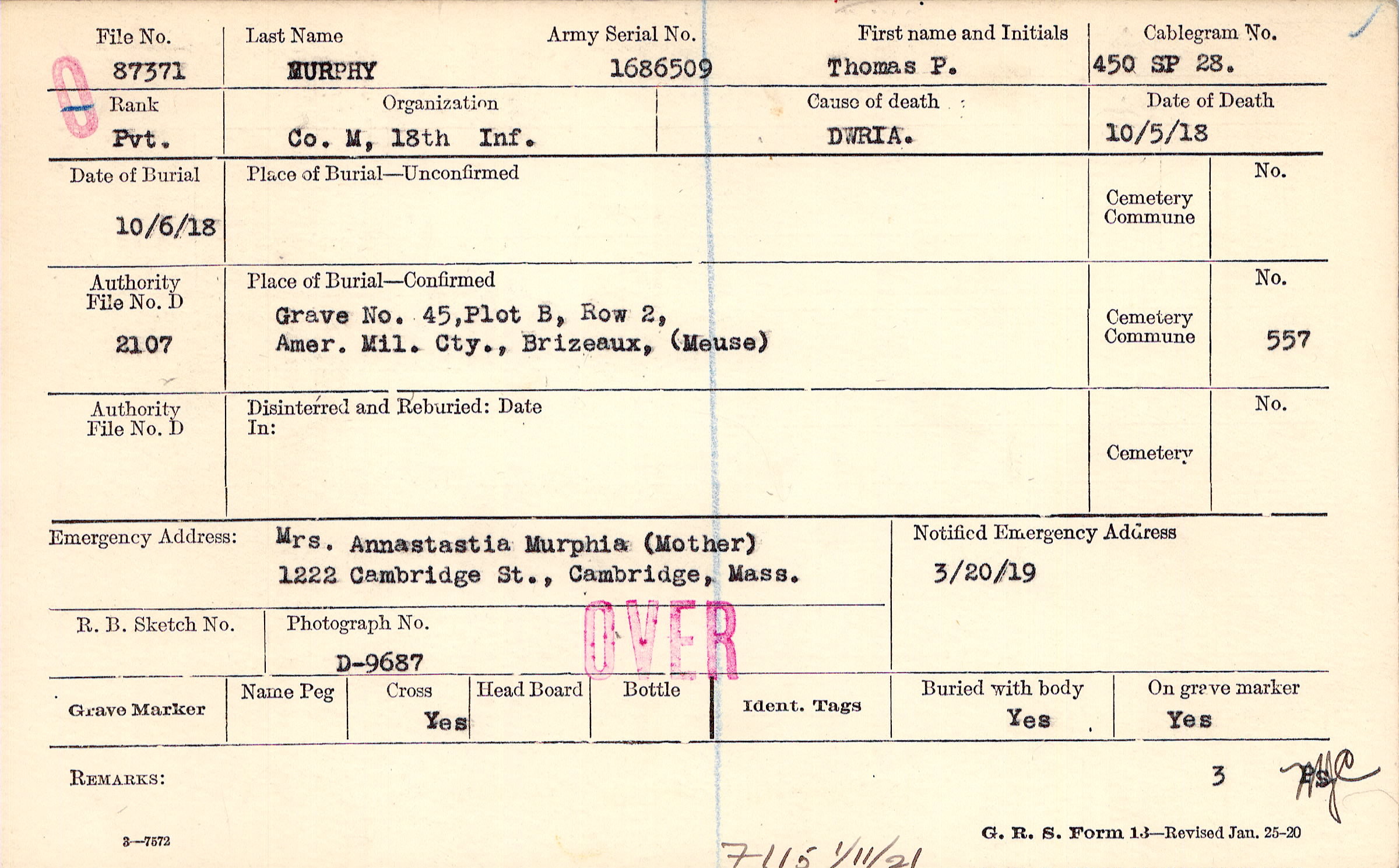 Mrs. Annastastia Murphia (Mother), 1222 Cambridge St., Cambridge, Mass.