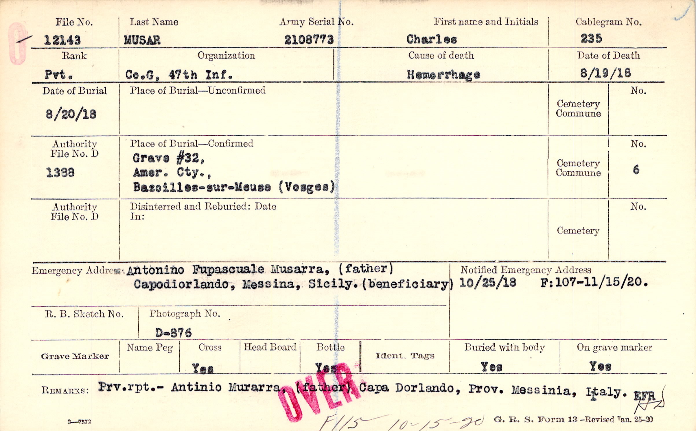 Antonino Fupascuale Musarra, (father), Capodiorlando, Messina, Sicily., (beneficiary)