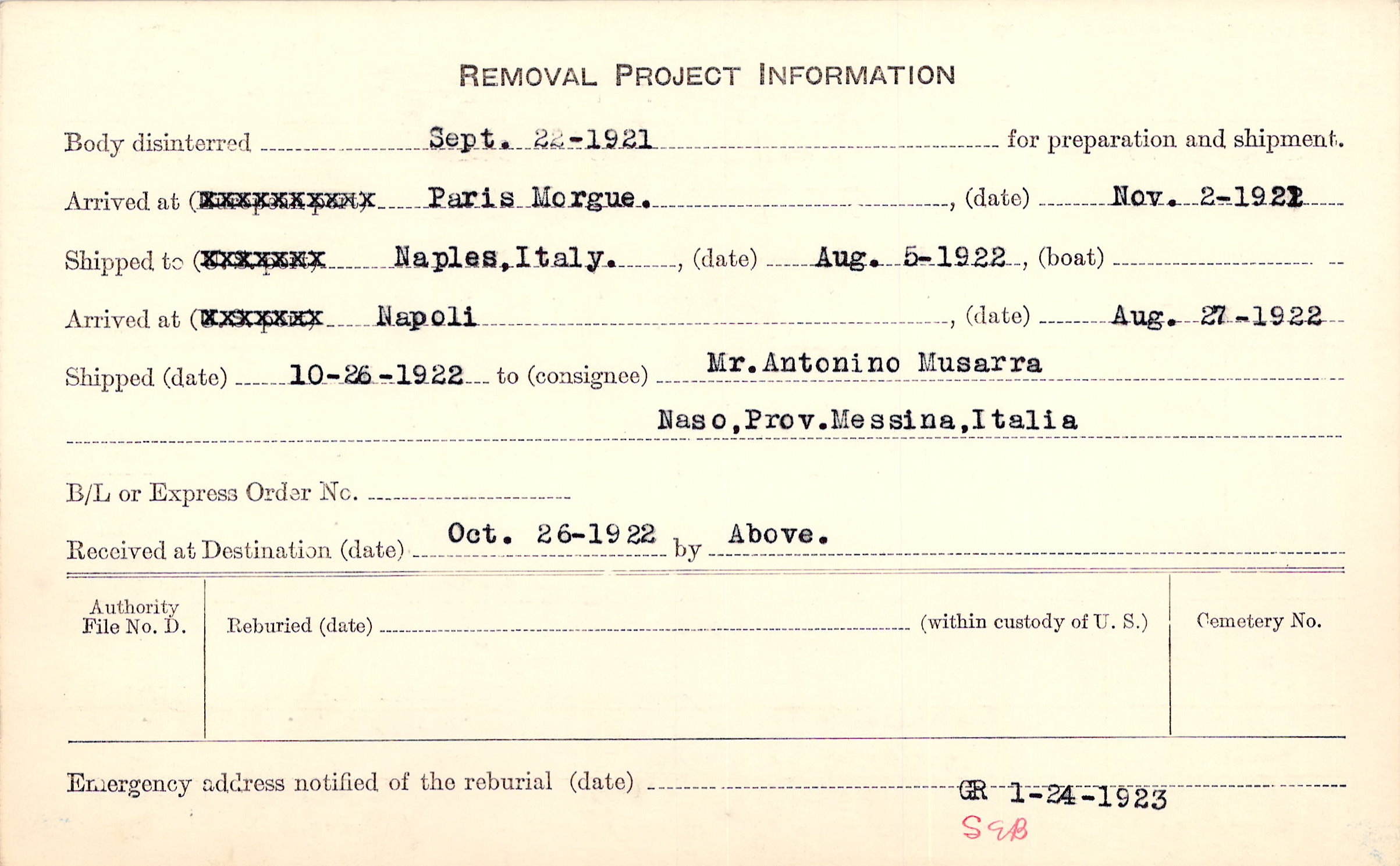 Body disinterred 9/22/1921 for preparation and shipment.