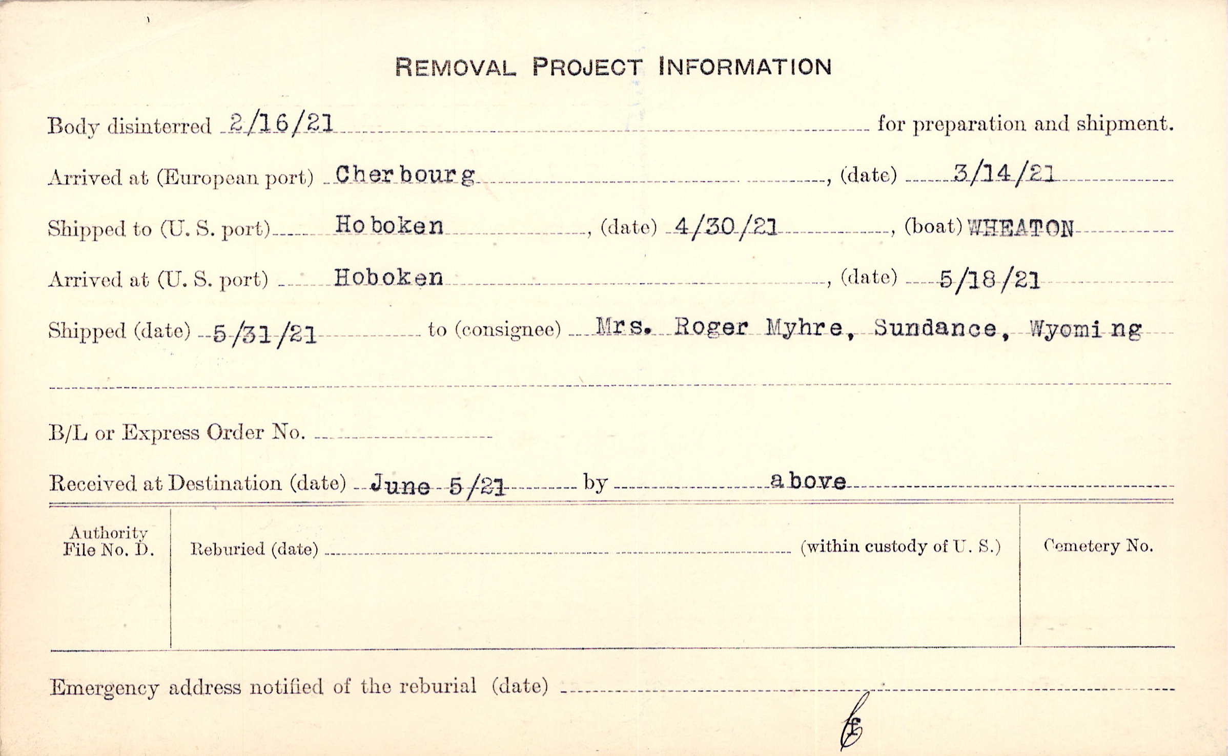 Body disinterred 2/16/1921 for preparation and shipment.