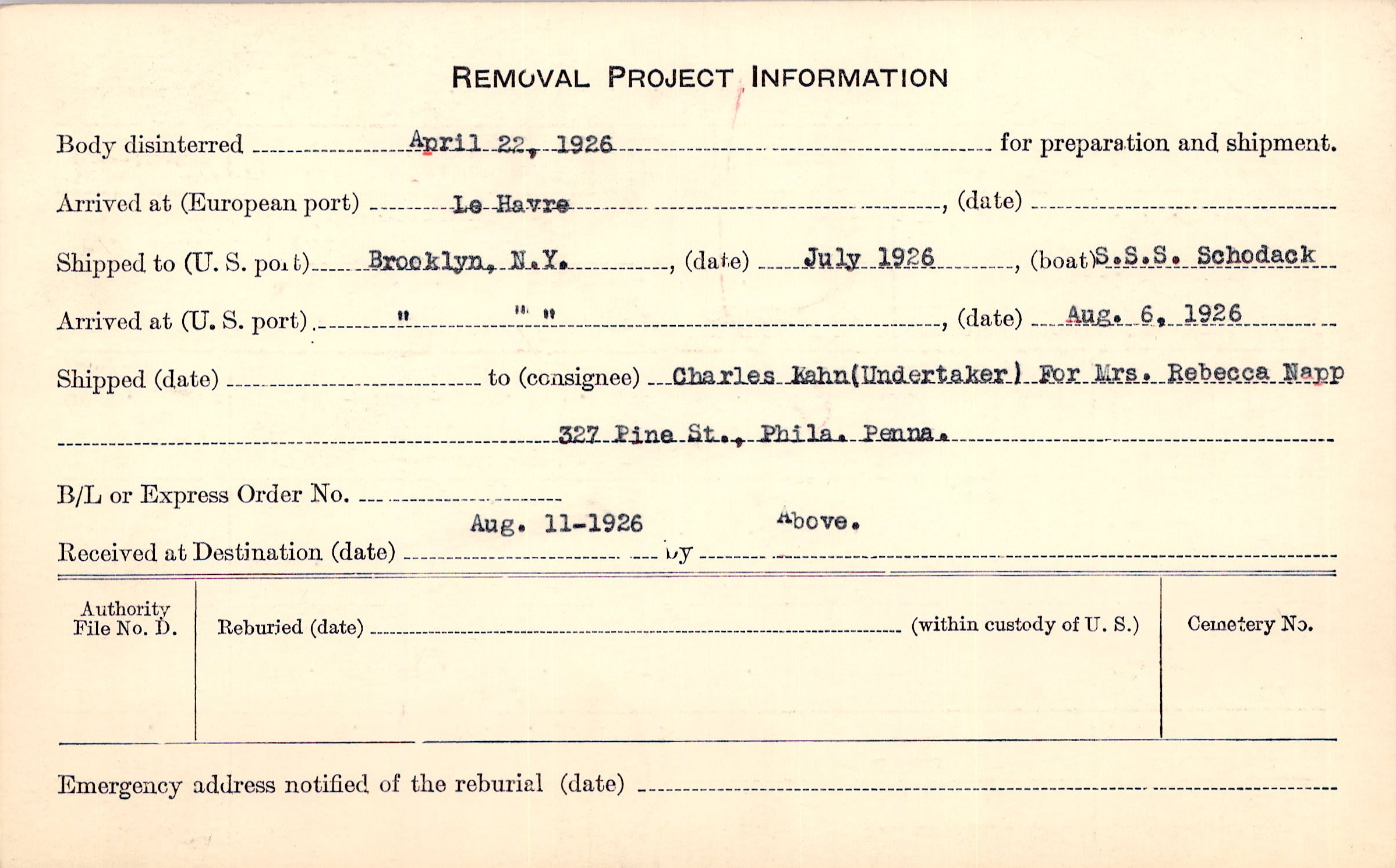 to Charles Kahn (Undertaker) For Mrs. Rebecca Napp, 327 Pine St., Philadelphia, Penna.