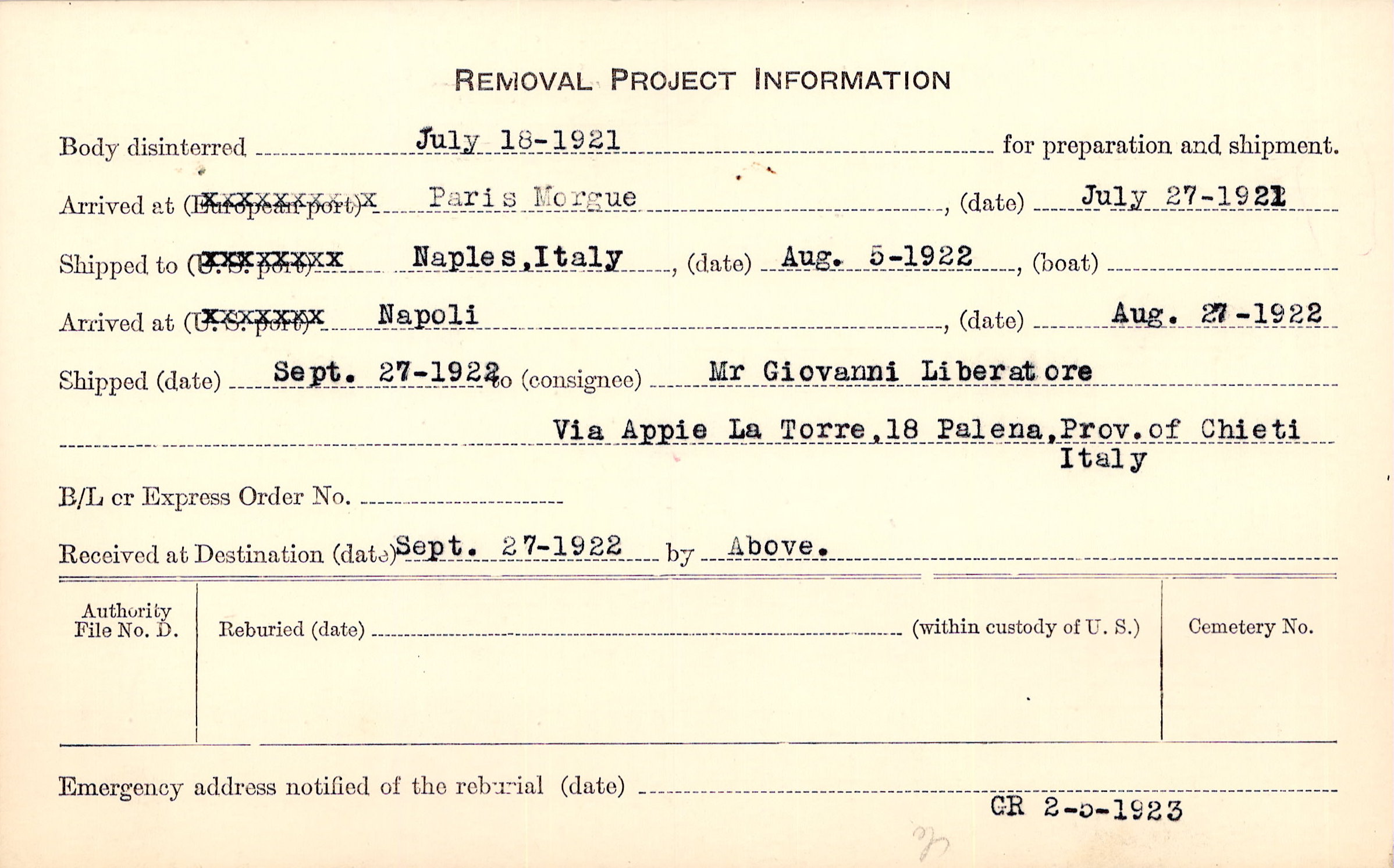to Mr Giovanni Liberatore, Via Appie La Torre, 18 Palena, Prov. of Chieti, Italy.