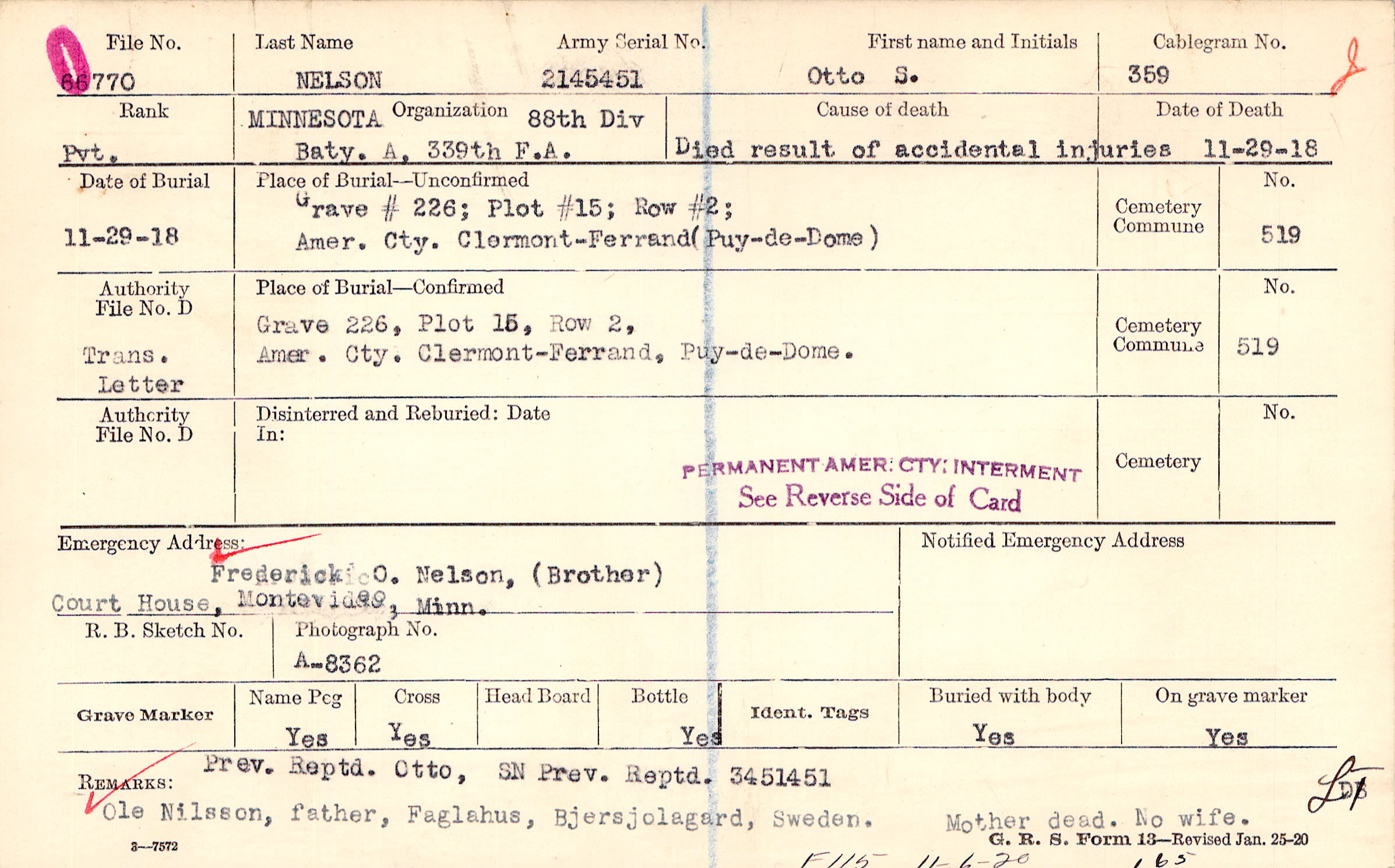 Prev. Reptd. Otto, SN Prev. Reptd. 3451451 Ole Nilsson, father, Faglahus, Bjersjolagard, Sweden. Mother dead. No wife.