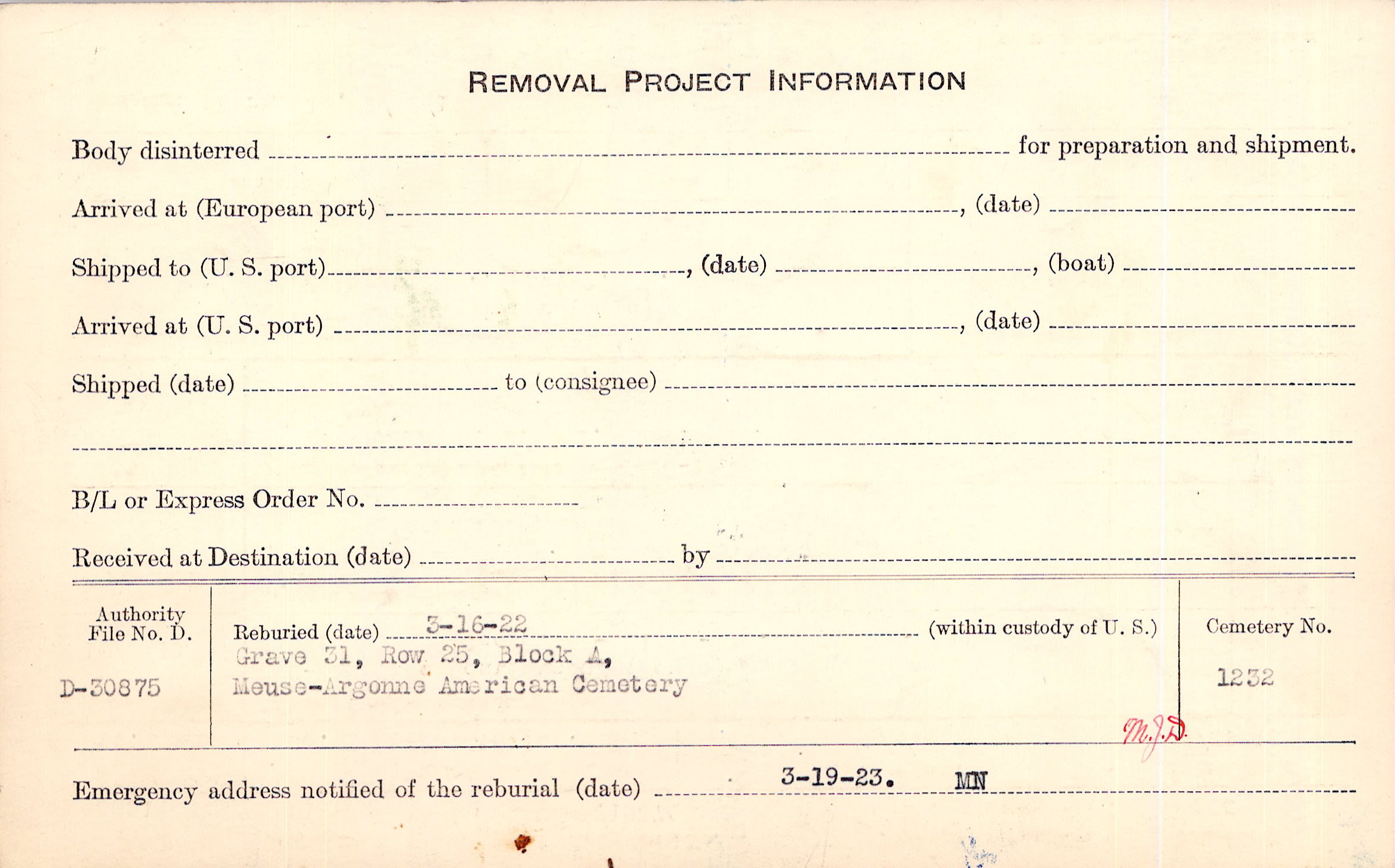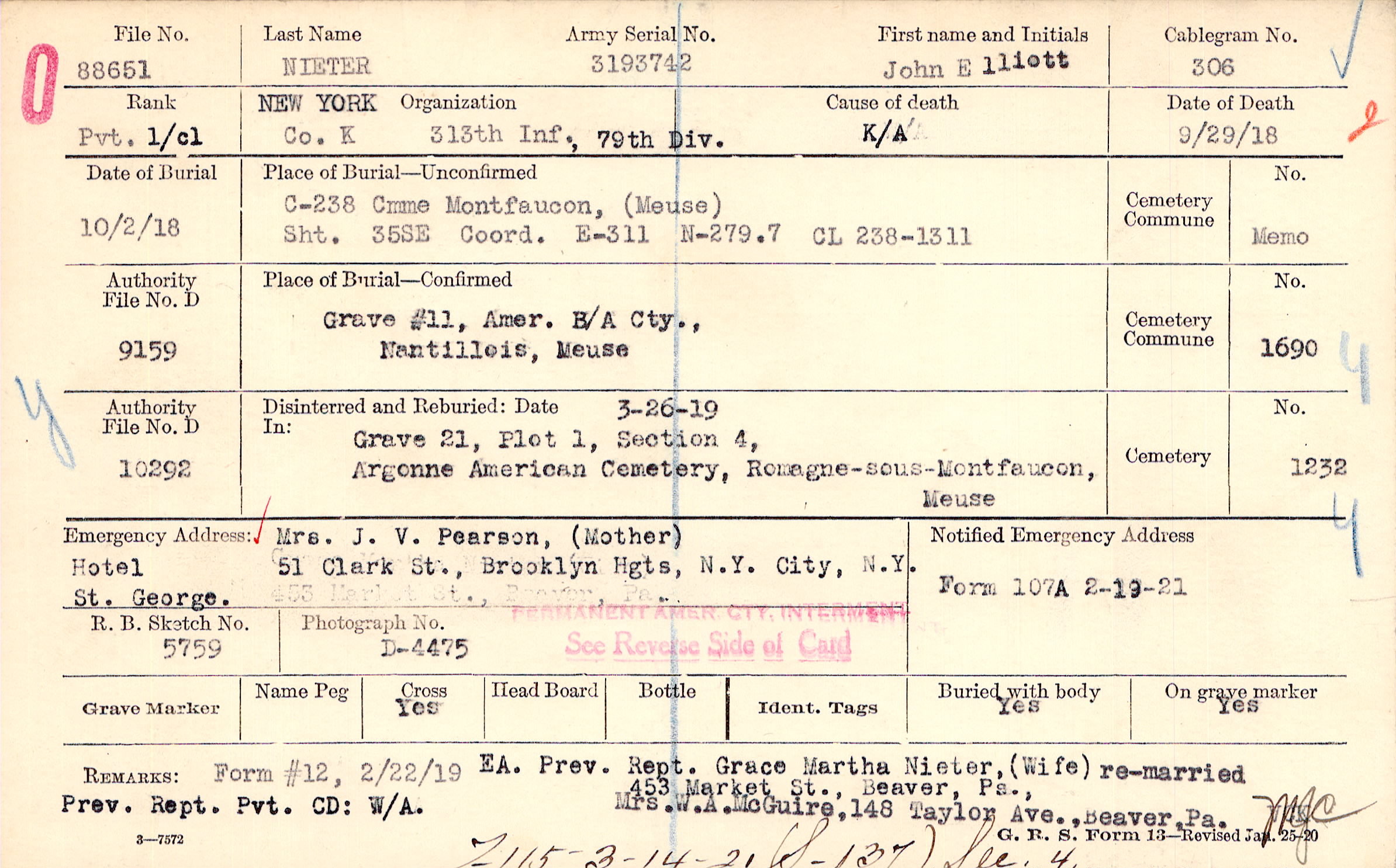 EA. Prev. Rept. Grace Martha Nieter, (Wife) re-married, 453 Market St., Beaver, Pa., Mrs. W. A. McGuire, 148 Taylor Ave., Beaver, Pa. Prev. Rept. Pvt. CD: W/A., From #12 2/22/19, F-115-3-14-21 (S-137) Sec. 4