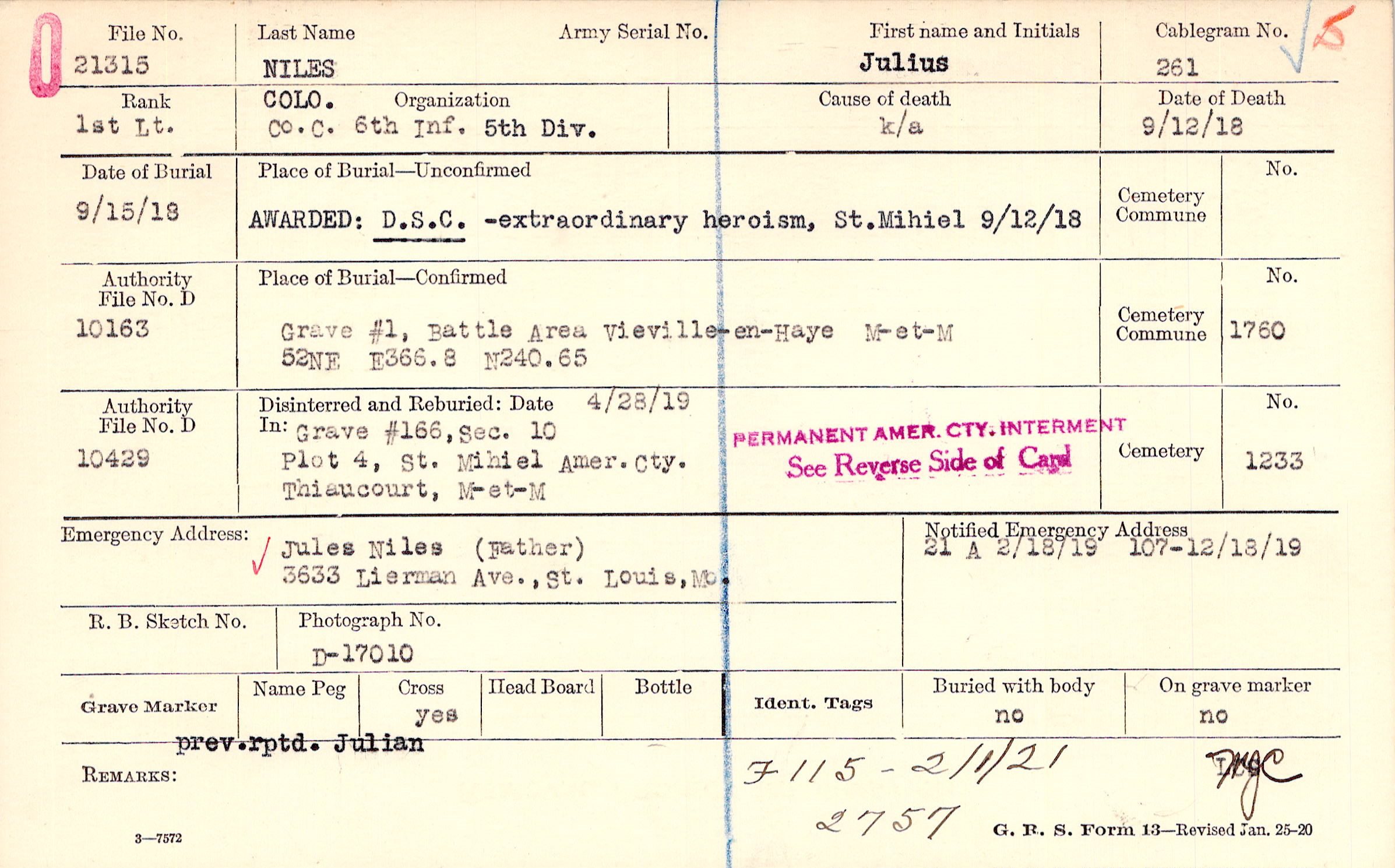 Jules Niles (Father), 3633 Lierman Ave. St. Louis, Mo.