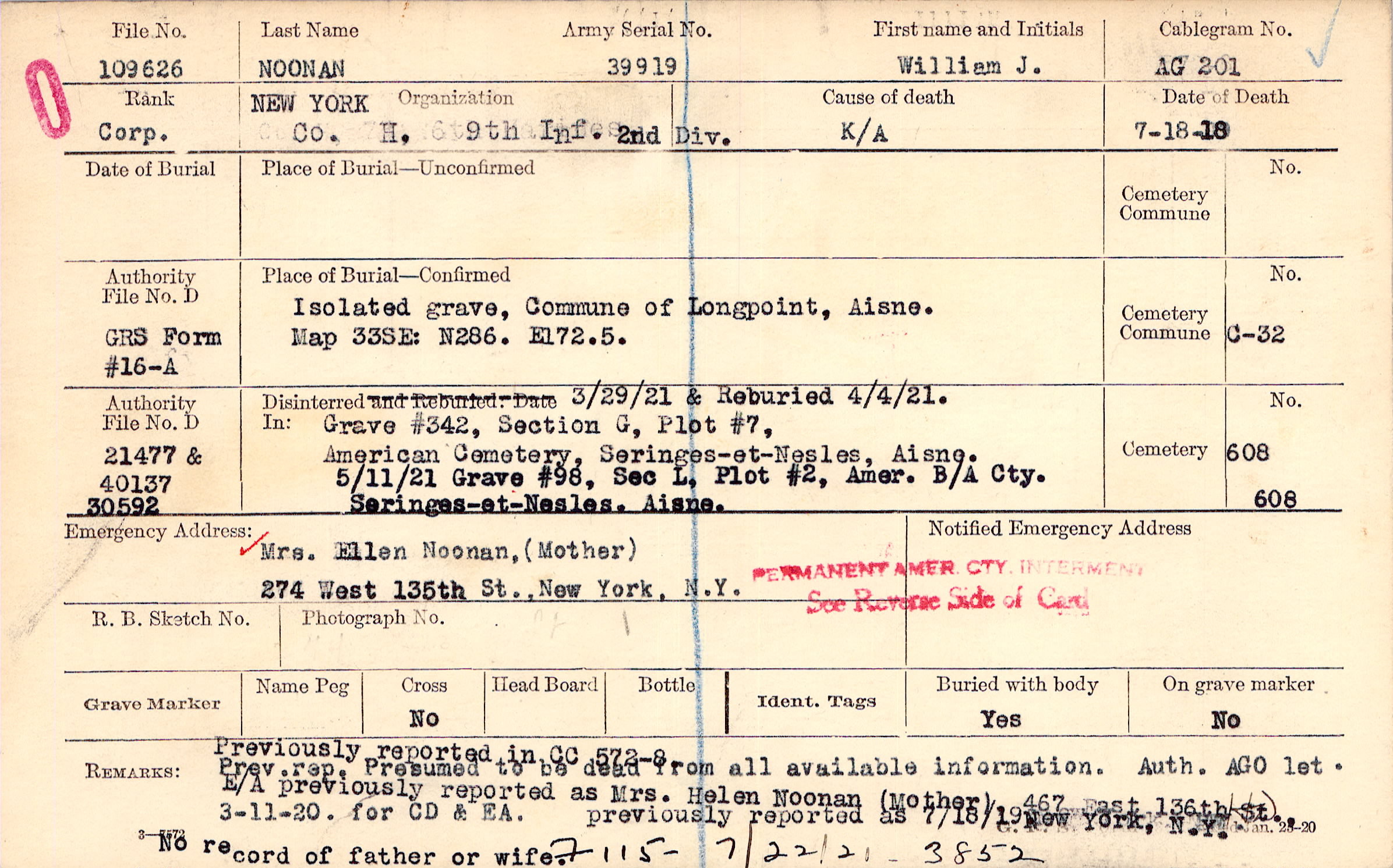 Mrs. Ellen Noonan, (Mother), 274 West 135th St., New York, N.Y.