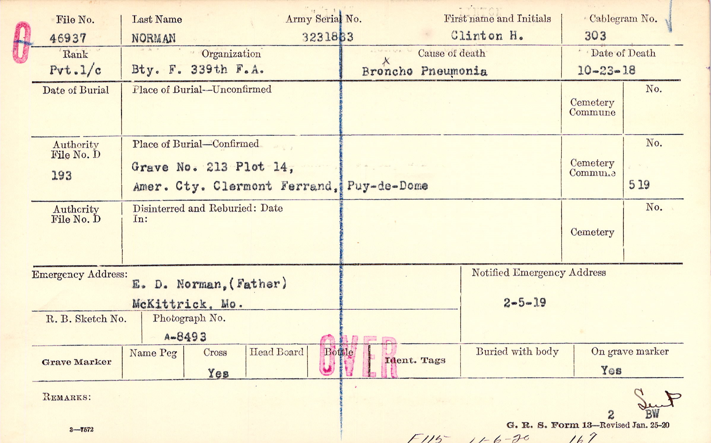Grave 213, Plot 14, Amer. Cty., Clermont Ferrand, Puy-de-Dome