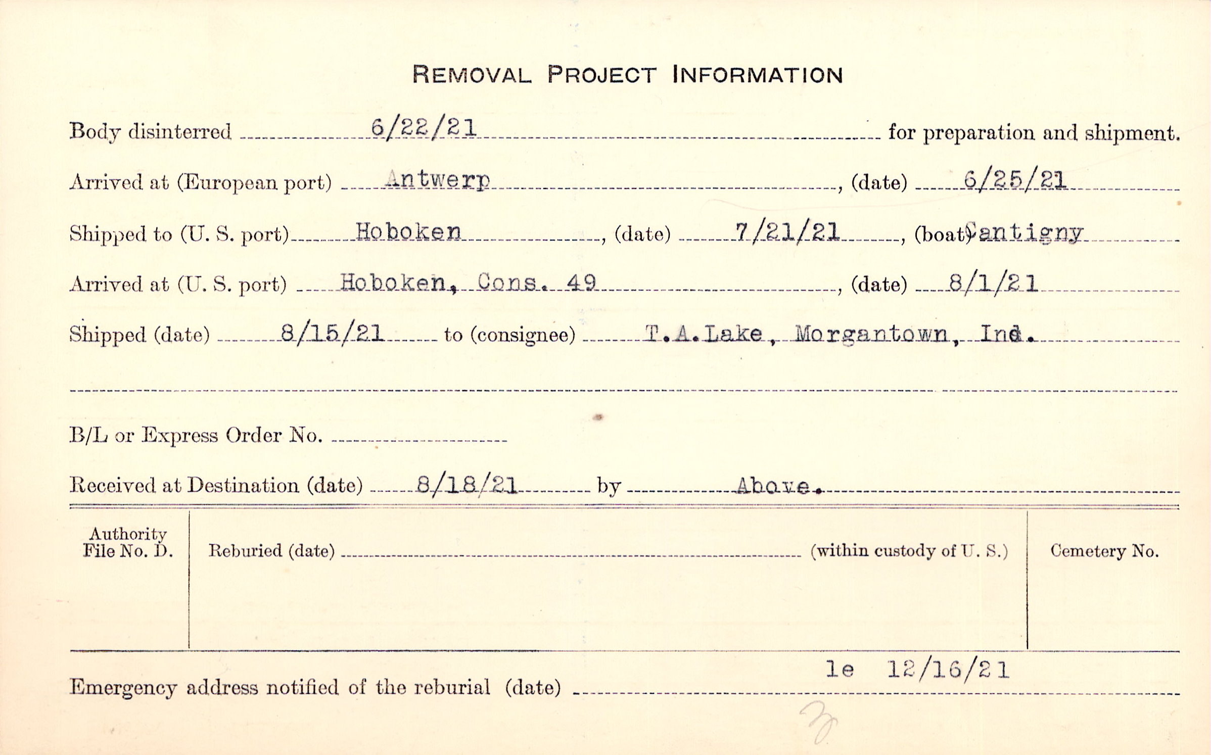 Body disinterred 6/22/1921 for preparation and shipment.