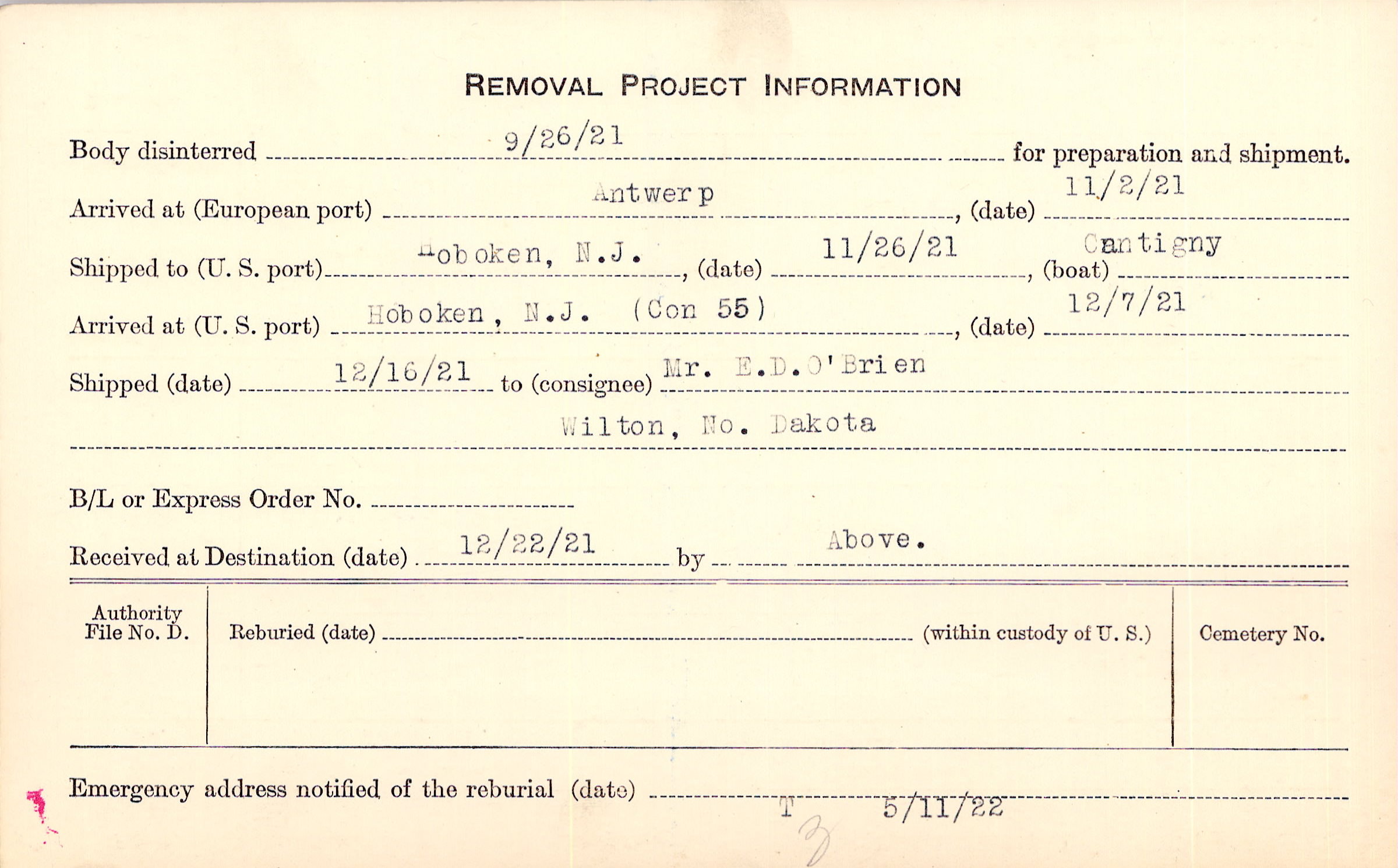 Body disinterred 9/26/1921 for preparation and shipment.