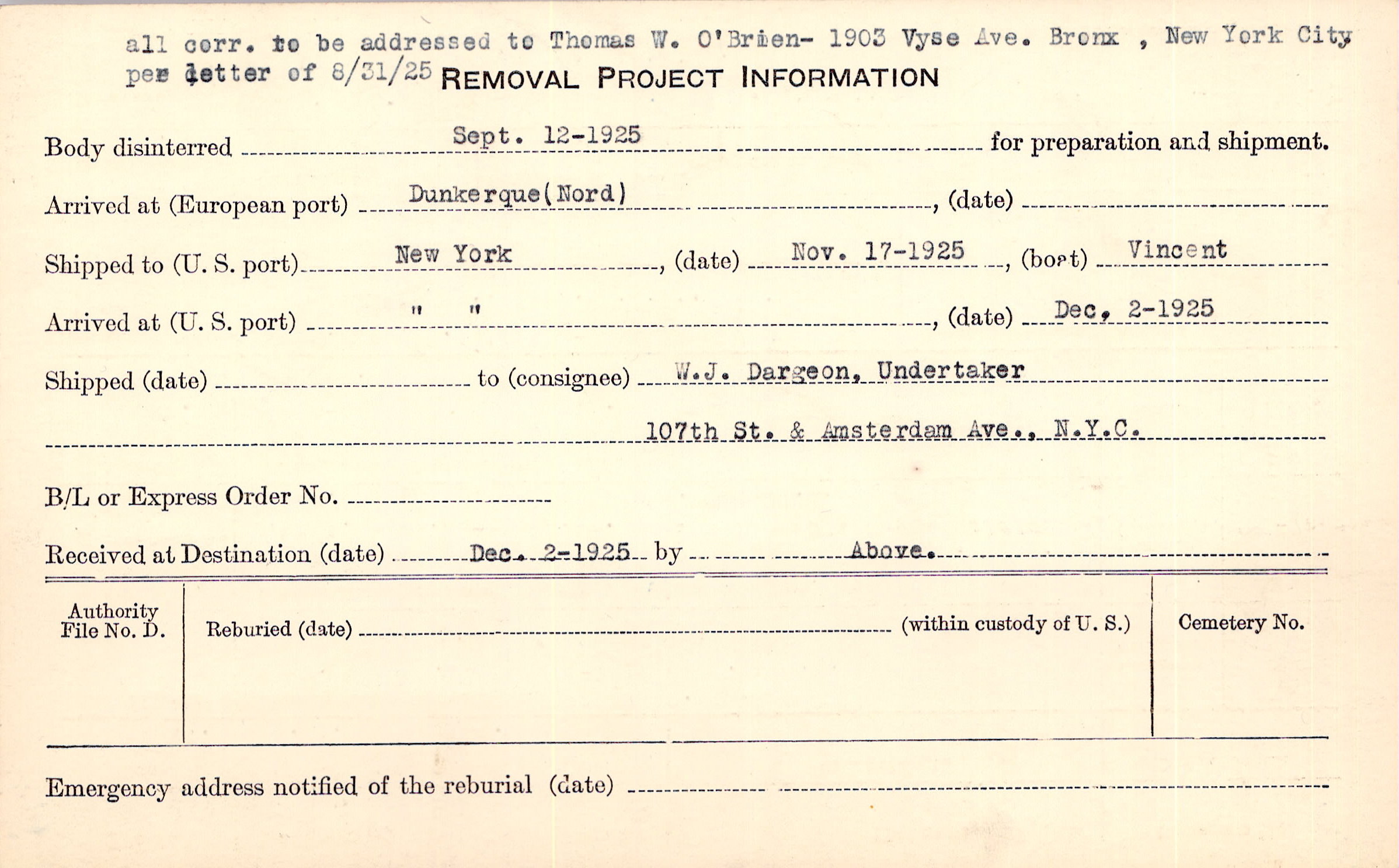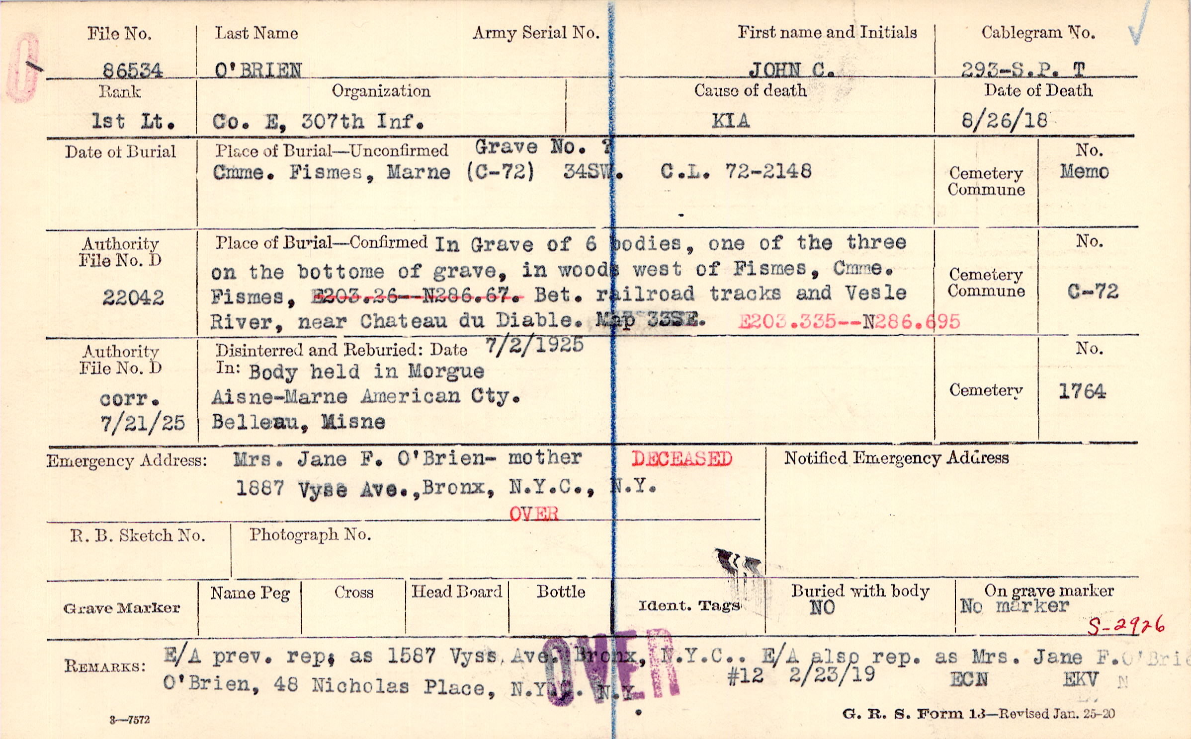 Mrs. Jane F. O'Brien- mother, 1887 Vyse Ave., Bronx, N.Y.C., N.Y., DECEASED OVER