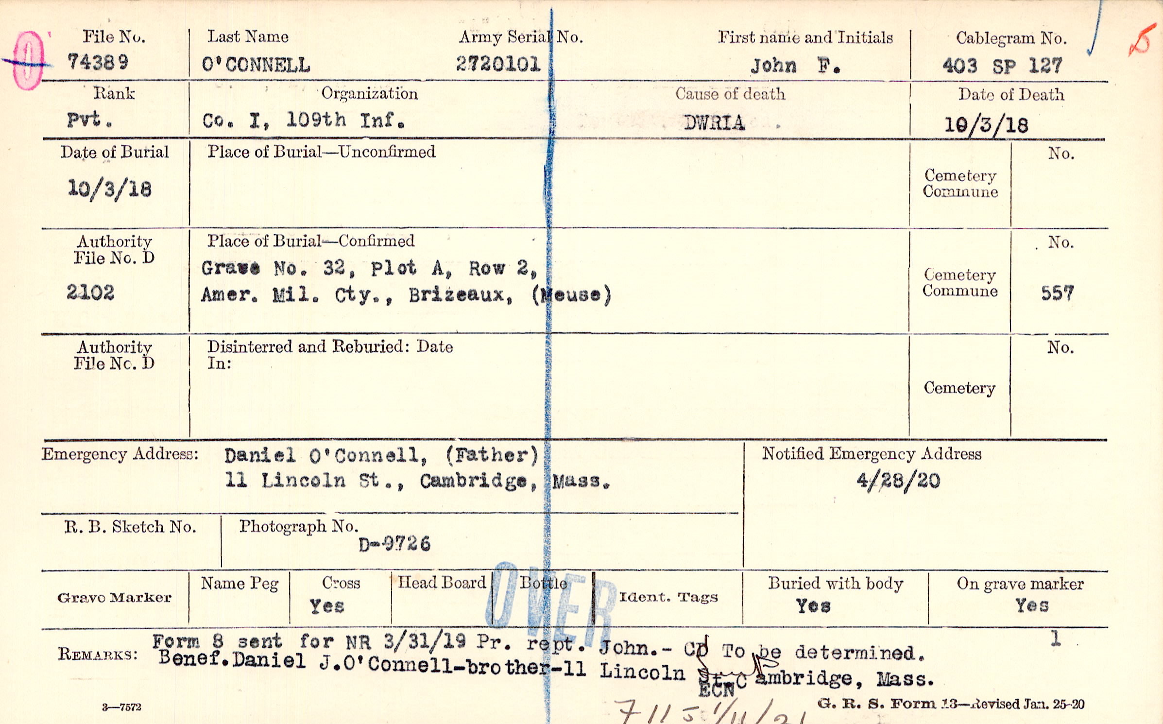 Pr. rept. John. - CD To be determined. Benef. Daniel J. O'Connell - brother - 11 Lincoln St. Cambridge, Mass., Form 8 sent for NR 3/31/19, F115 1/11/21