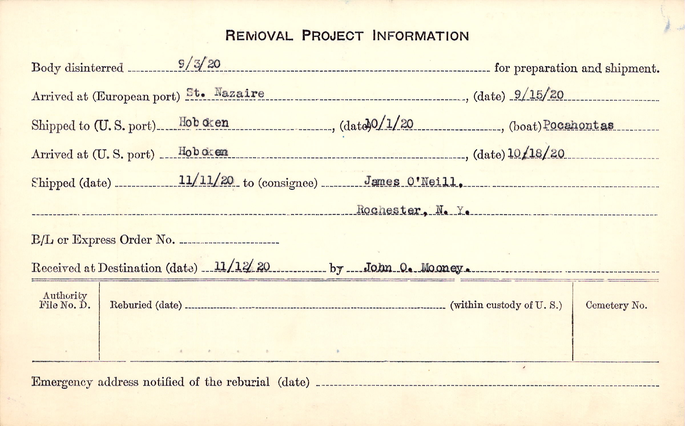 James O'Neil, (Father), 295 Frost Ave., Rochester, N.Y.