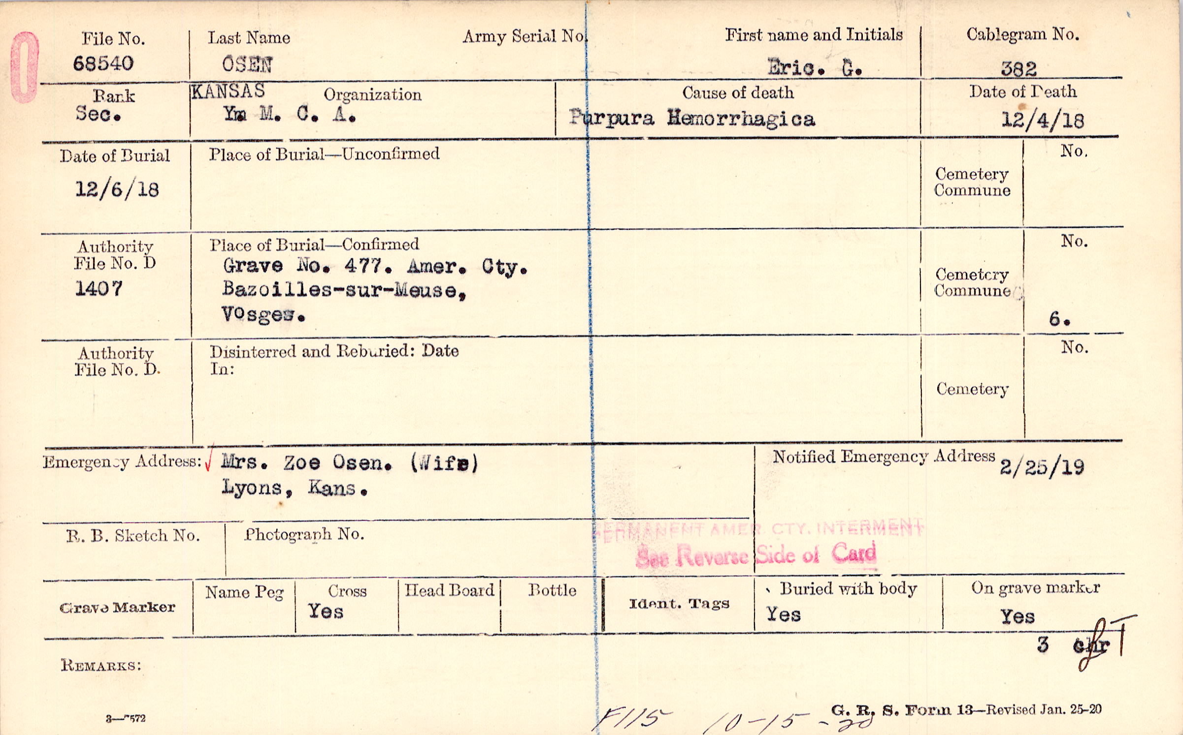 Grave 477, Amer. Cty., Bazoilles-sur-Meuse, Vosges.