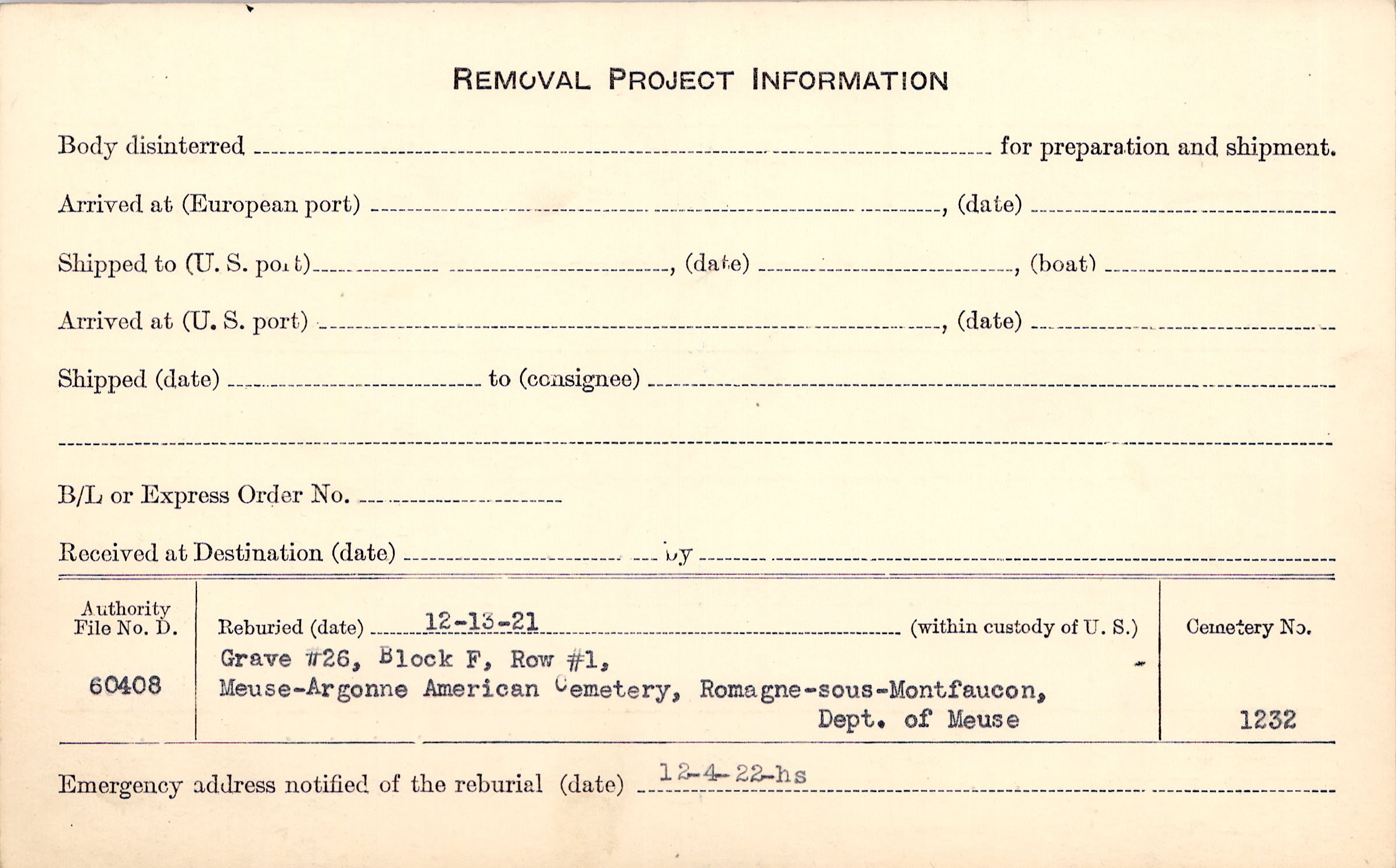 | Permanent Burial in Foreign Cemetery |